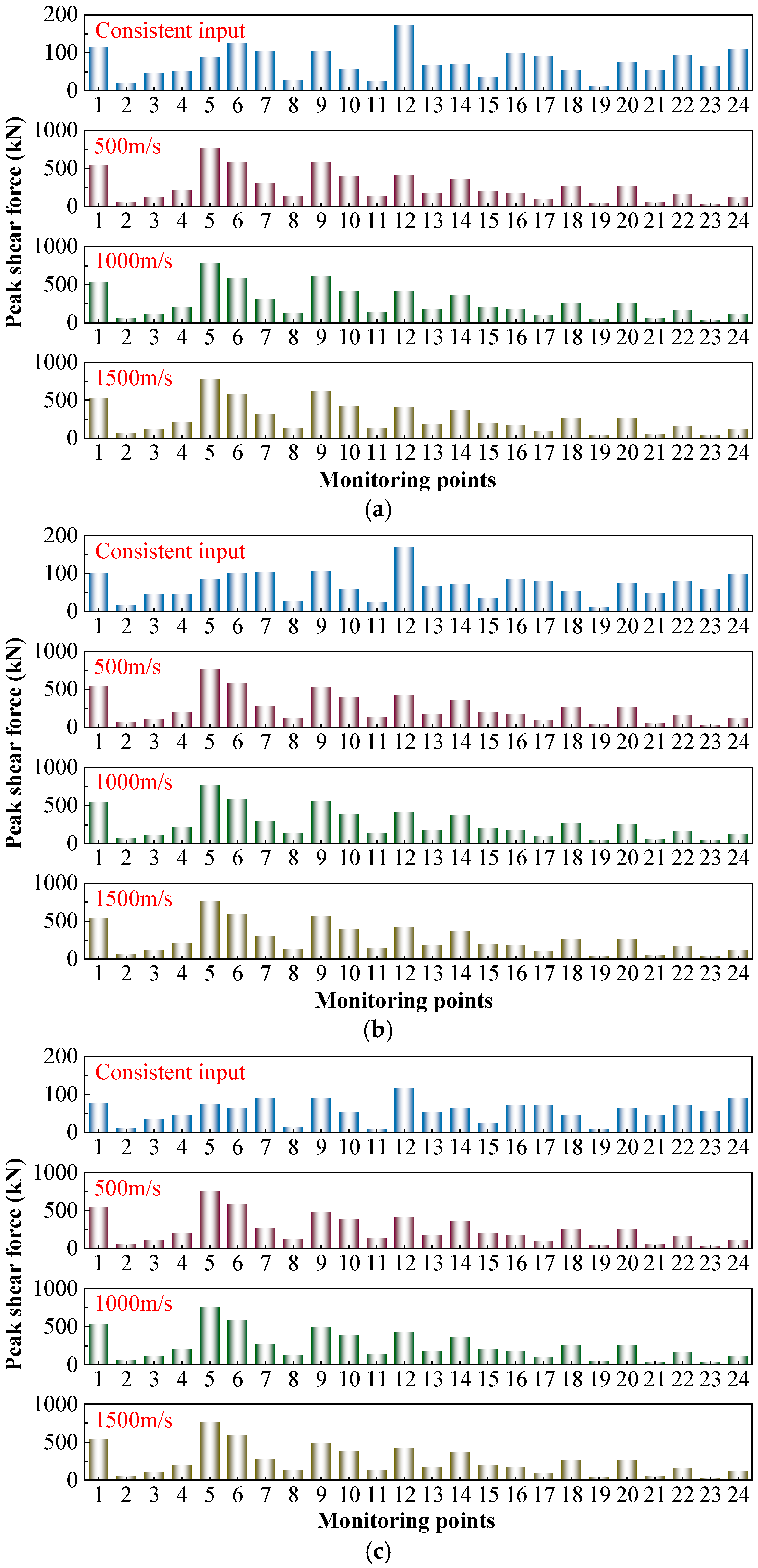 Under the 500 m/s condition, the peak shear forces at all monitoring points except points 21 and 23 significantly increased compared to the consistent input. Among these, point 5 showed the largest increase, with a shear force of 8.6 times that of the consistent input under the 500 m/s condition. The monitoring point #17 showed the smallest increase, only 1.07 times that of the consistent input. Under the 500 m/s condition, the monitoring point #5 exhibited the highest shear response (760.7008 kN), indicating that this point is most prone to shear failure. Monitoring points #6, #7, and #9 at the same elevation also exhibited high peak shear values, suggesting that the slab in this layer is prone to shear failure. Monitoring point 1 also exhibited a high peak shear value, indicating that the bottom of the left wall is also prone to shear failure.