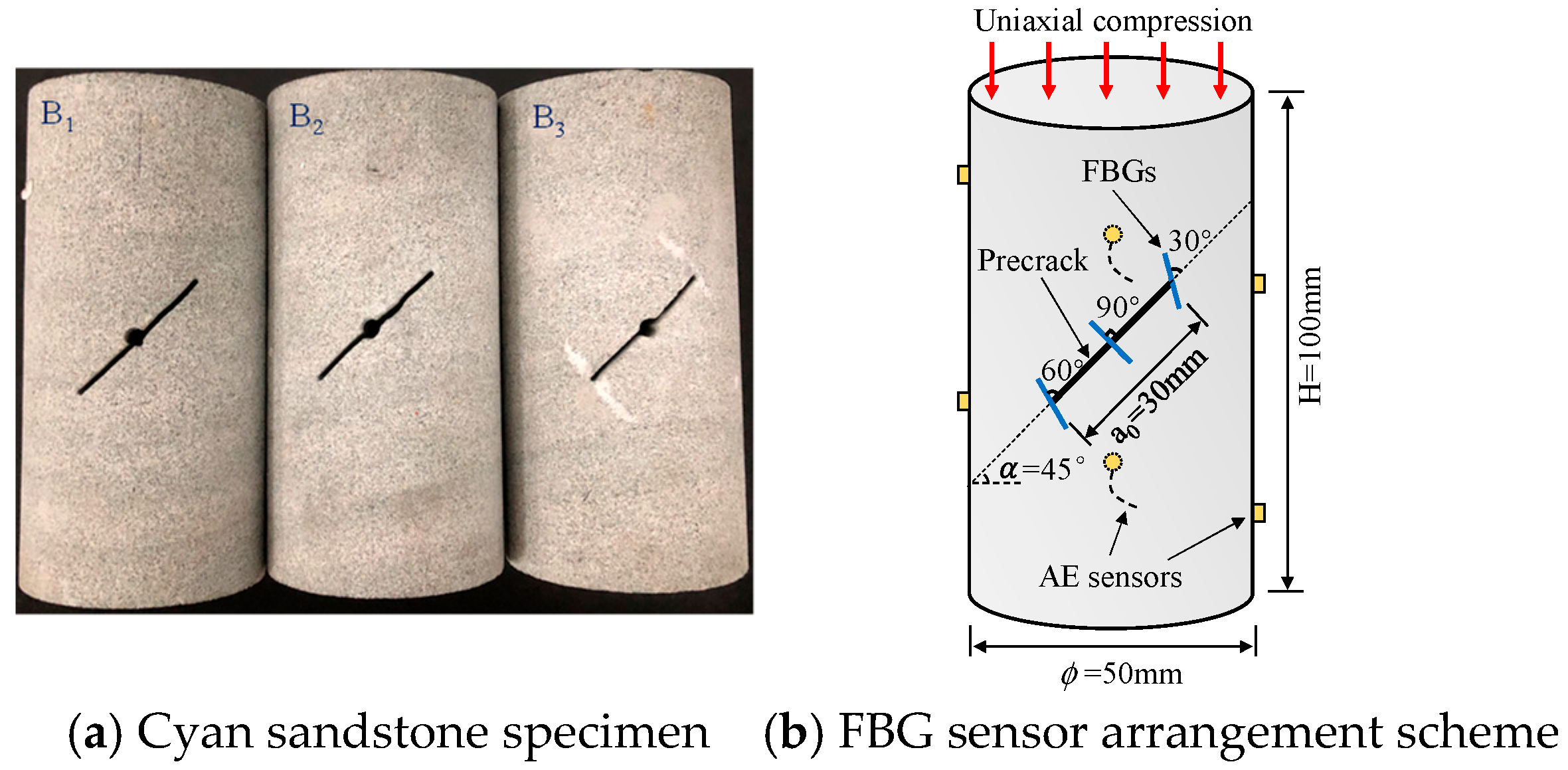 During the failure processes of the pre-fractured rock specimens, the wavelength, bandwidth, and peak reflectivity values of the FBG spectra exhibited discontinuous variations. Extensive studies have demonstrated that the damage variable,