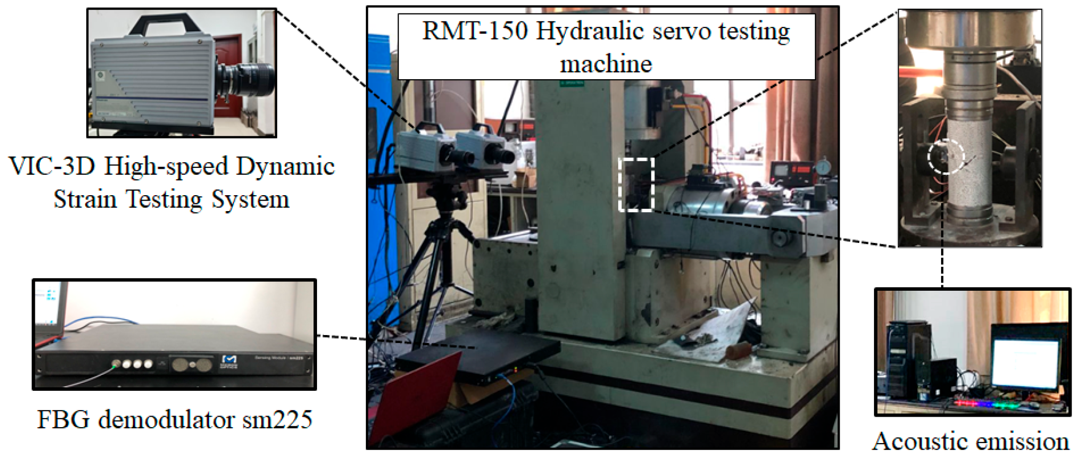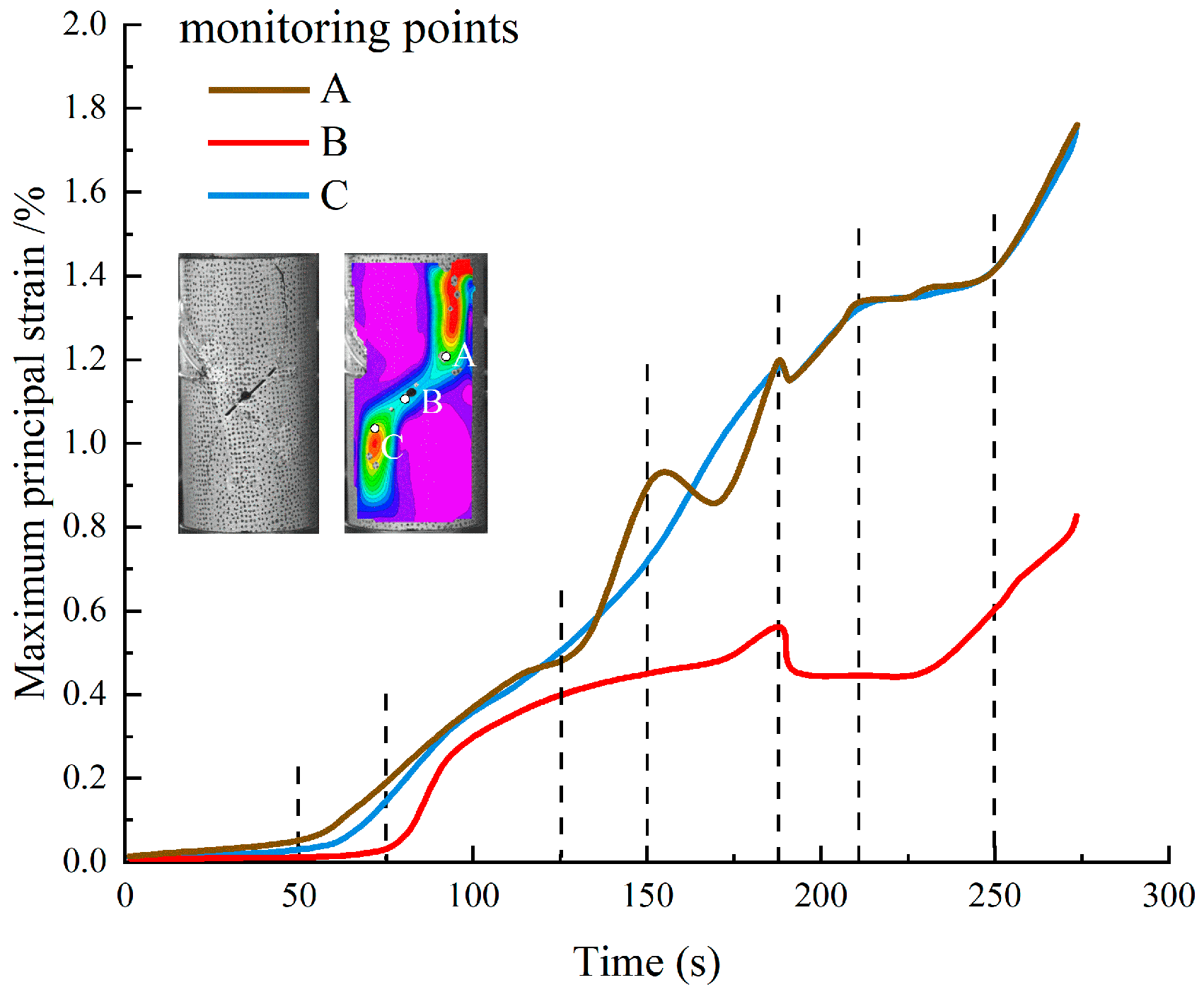 Figure 20. At 50 s into the loading process, the principal strain at the crack tip began to increase slowly; the principal strain at point B started to increase at 70 s, which indicates that the pre-existing crack in the specimen had begun to close gradually. When the loading time approached 125 s and the axial stress reached 70% of the initial yield strength, the strain growth rate increased and strain localization appeared at the crack tip. At 150 s into the loading process, the principal strain at point A decreased and the wing crack that was perpendicular to the crack tip at point A began to propagate, which caused the stress to be redistributed and the pre-existing crack to close further. Since no wing crack appeared at the crack tip at point C, continued loading caused the principal strain at point C to gradually exceed that of point A. At 180 s, the principal strain briefly decreased and then rapidly increased, which marked the initiation of the pre-existing crack propagation. As the loading continued, shear-locking effects were generated with the insufficiently propagated wing cracks; however, these effects failed within a short time, after which the crack continued to propagate. At approximately 210 s into the loading process, the principal strain at the crack tip began to increase steadily, at which time new shear-locking effects were produced during the continued crack propagation. Due to the rapid failure of the second shear-locking event, the FBGs failed to capture this transient process. At 250 s, the principal strain at the crack tip increased rapidly as the cracks gradually coalesced and the pre-existing crack closed.