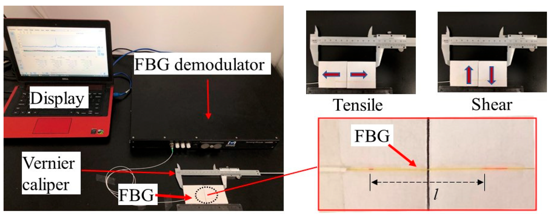 Equations (15) and (16) demonstrate that, when the FBG is subjected to shear stress (and thus the grating length remains constant) the variations in the peak reflectivity can be primarily determined by the coupling coefficient, κ. Conversely, when the FBG is subjected to tensile stress, the spectral bandwidth variations are mainly governed by the grating length,