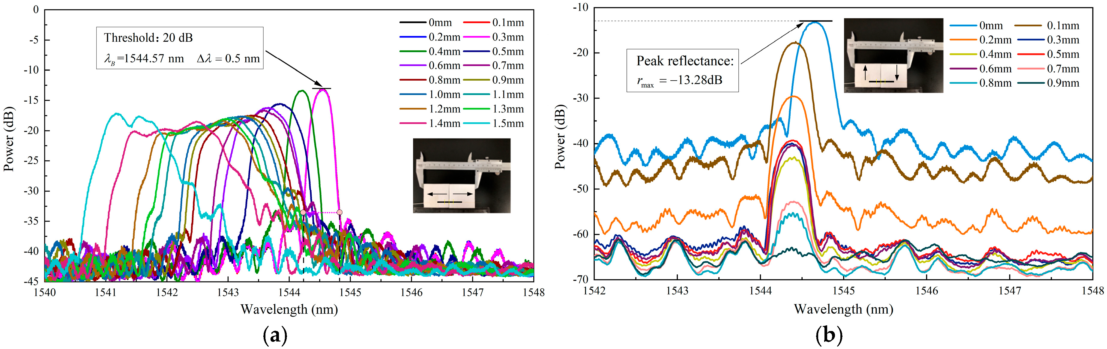 Figure 9d. No significant bandwidth broadening or peak reflectivity reduction was observed, but a distinct leftward shift of the central wavelength occurred. Through comparison with spectral variations during crack propagation stages, such spectral alterations were confirmed to exclude background strain fluctuations or environmental interference.