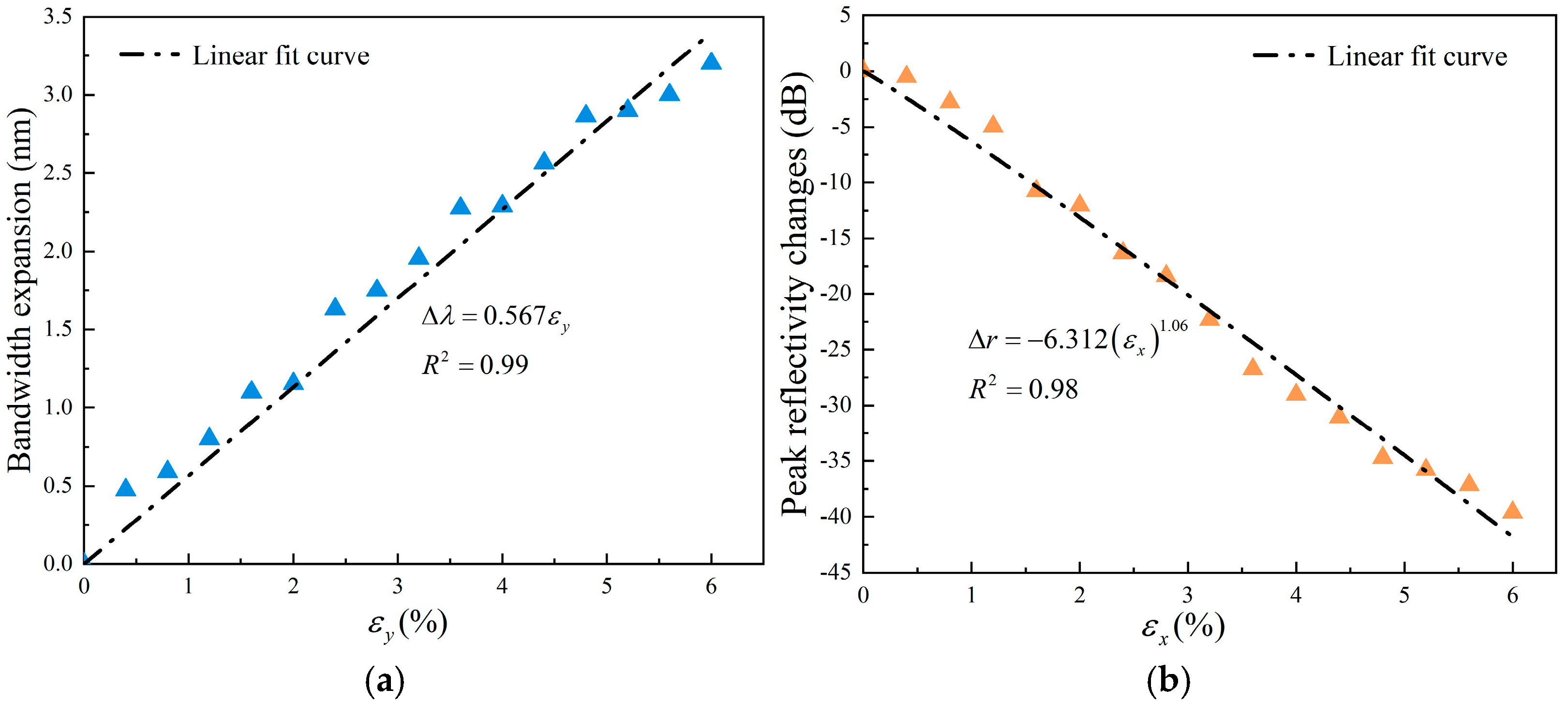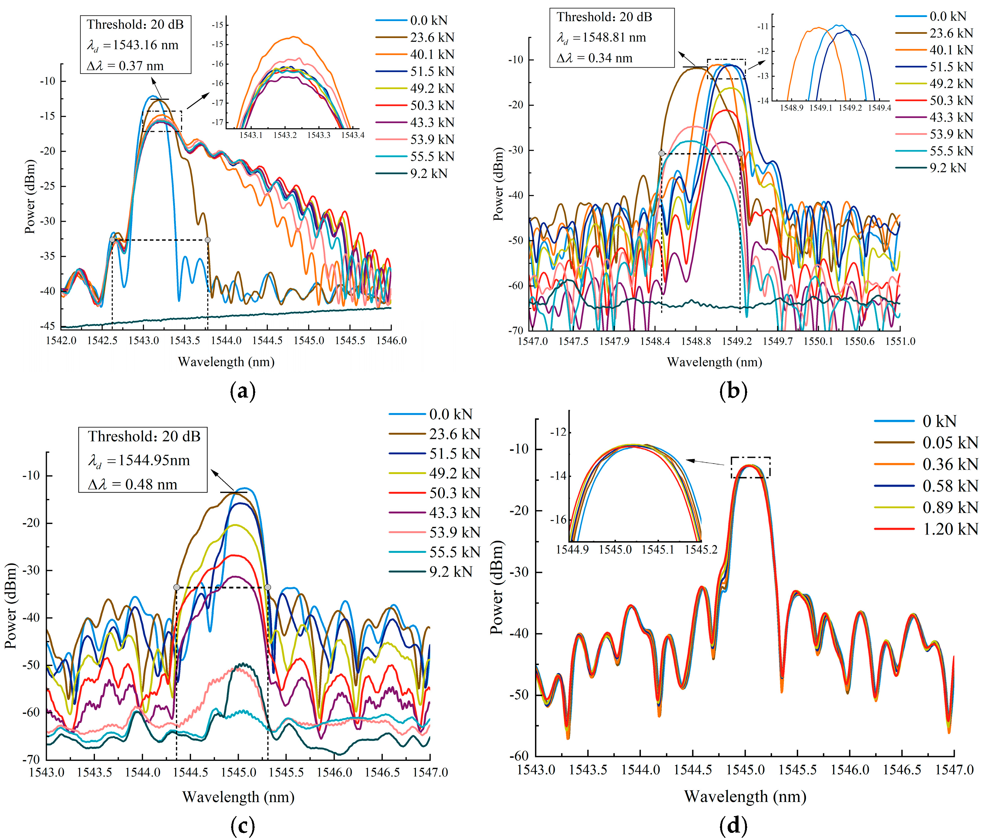 Figure 9a), when the load was 23.6 kN, the central wavelength was measured to be 1543.16 nm, the bandwidth expansion (Δλ) was 0.37 nm, and peak reflectivity was −12.7 dBm. When the load increased to 50.3 kN, the spectrum showed significant broadening, with an increase in Δλ to 2.62 nm, while the peak reflectivity gradually decreased, with a maximum reduction within −15 dBm. For the FBG oriented at 60° (