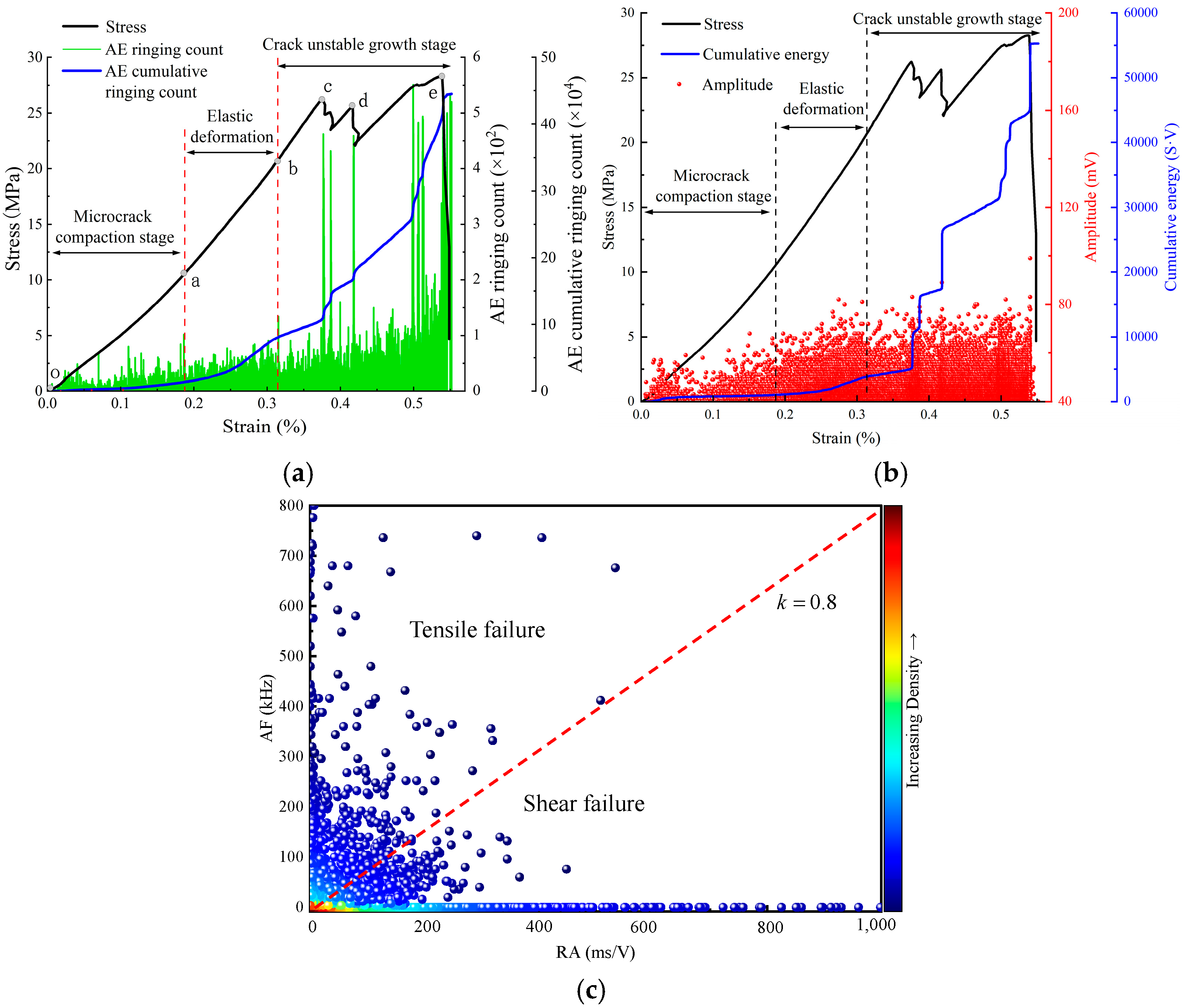 Figure 8. During the initial loading, internal microcracks closed and the rock was in the compaction stage. The compaction limit load at point a was 12.5 MPa, and the AE exhibited fluctuations, generating a series of low-amplitude AE events. The cumulative energy demonstrated a slow increase, following a near-linear trend, reflecting predominant steady dissipation of energy release. After point a, the deformation entered a linear growth stage, and no significant changes were evident in the AE signal during this elastic stage. Next, the failure process deviates from this linearity, and the primary failure mode was unstable propagation of the prefabricated fissure. When the axial loading reached point b in the curve (σ