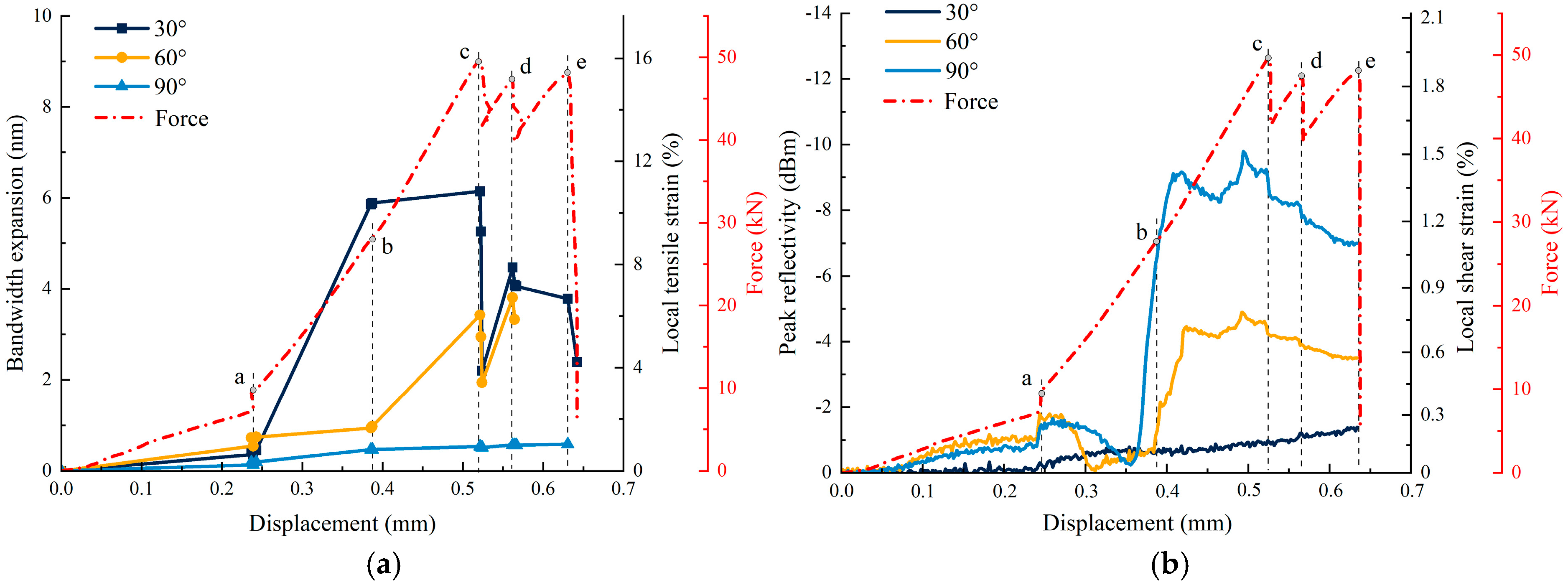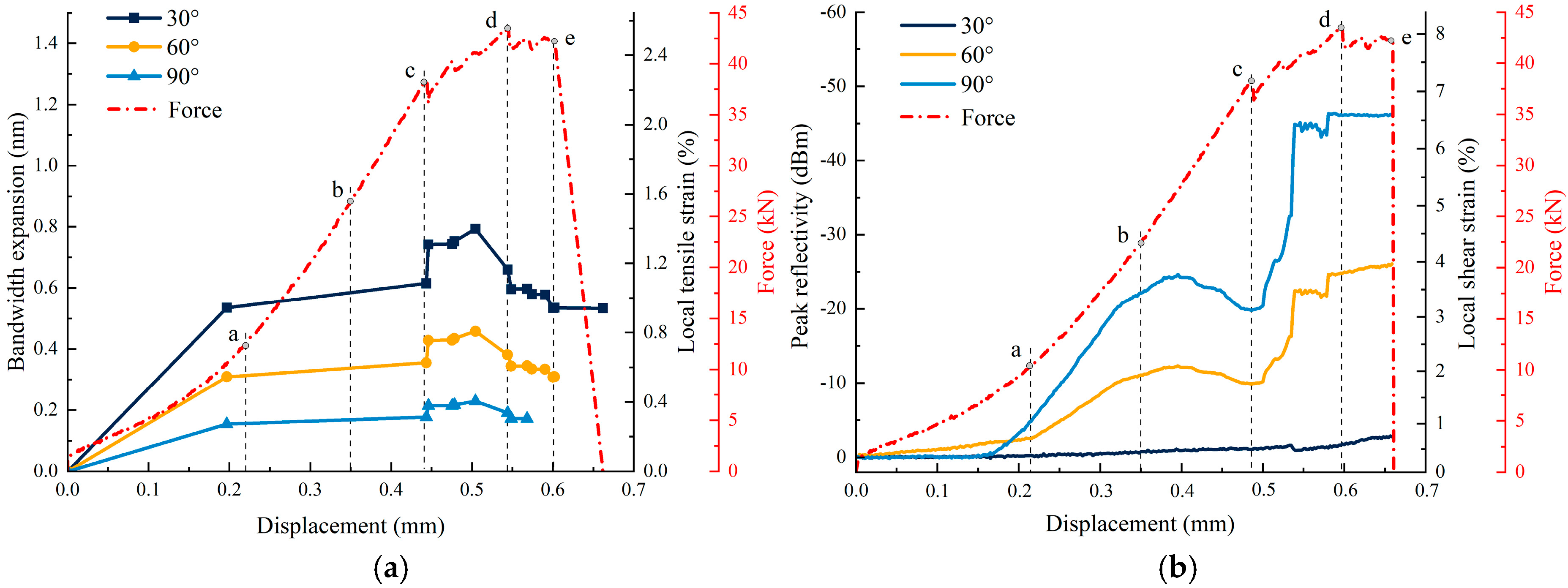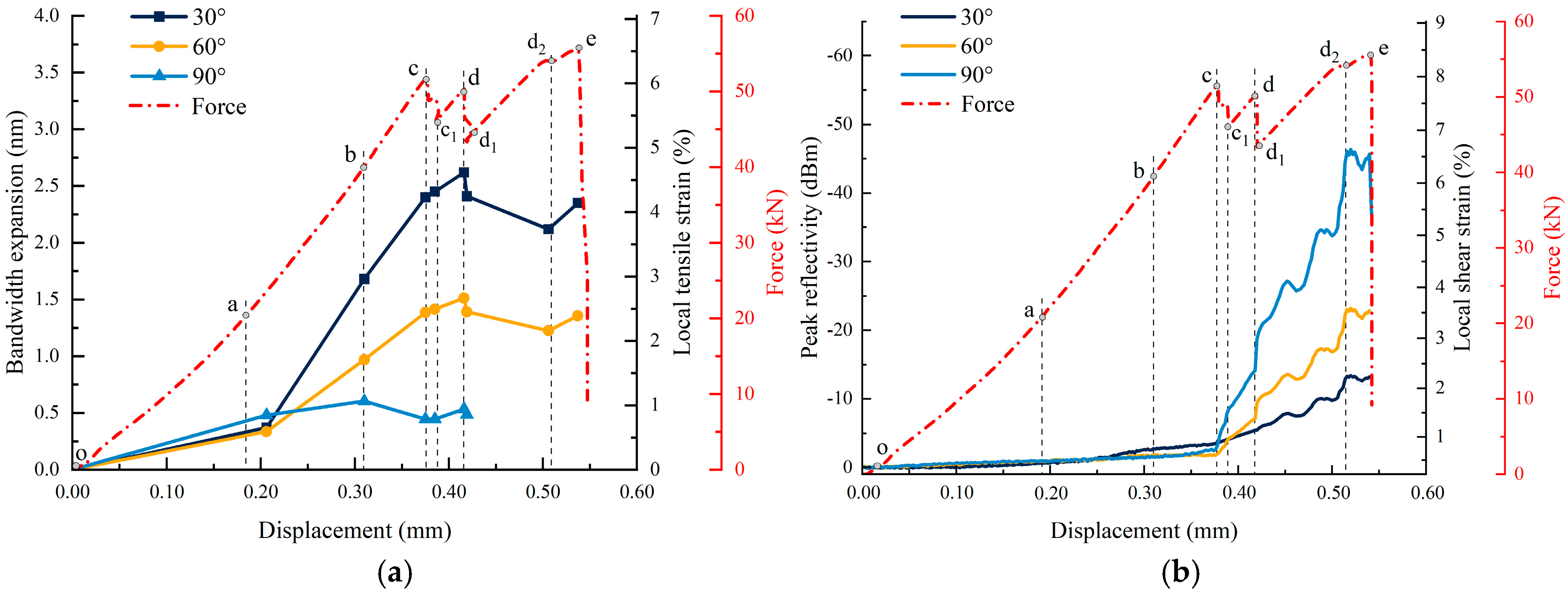 Figure 8. The results demonstrate that, from the initial loading to complete failure, the FBG spectral bandwidth expansion exhibited distinct variation trends in different loading stages. Specifically, the FBG oriented at 30° had the most significant bandwidth expansion changes, while the FBG oriented at 90° displayed smaller variations and eventually was unable to capture bandwidth data in the later loading stages. Conversely, the peak-reflectivity variations had an opposite trend; the FBG oriented at 90° exhibited the most pronounced reflectivity variations, while the FBG oriented at 30° showed relatively minor changes. When the pre-cracked cyan sandstone was loaded to point a under uniaxial compression conditions, all the FBGs exhibited relatively small variations. Using the FBG calibration results, the local tensile and shear strains along the pre-existing crack were calculated to be 0.17% and 0.18%, respectively. These results indicate that, during the oa stage, the microcracks and inherent defects within the rock were being compacted, and only minor strains were generated around the pre-existing crack. Upon further loading to point b, the bandwidth expansion values of the FBGs oriented at 30, 60, and 90° increased to 1.68, 0.97, and 0.61 nm, respectively, while the corresponding peak reflectivity values decreased to −2.74, −1.83, and −1.55 dB, respectively. During this stage, the local tensile and shear strains along the pre-existing crack reached 0.65 and 0.27%, respectively. During the ab loading phase, all the FBGs (and particularly the 30° FBG) exhibited significant bandwidth-expansion increases, while peak reflectivity exhibited only modest decreases (which were most pronounced for the 30° FBG). These observations confirm that the specimen experienced elastic deformation during this stage; in addition, the local tensile stress dominated in the direction of the pre-existing crack, while shear stress remained relatively small.