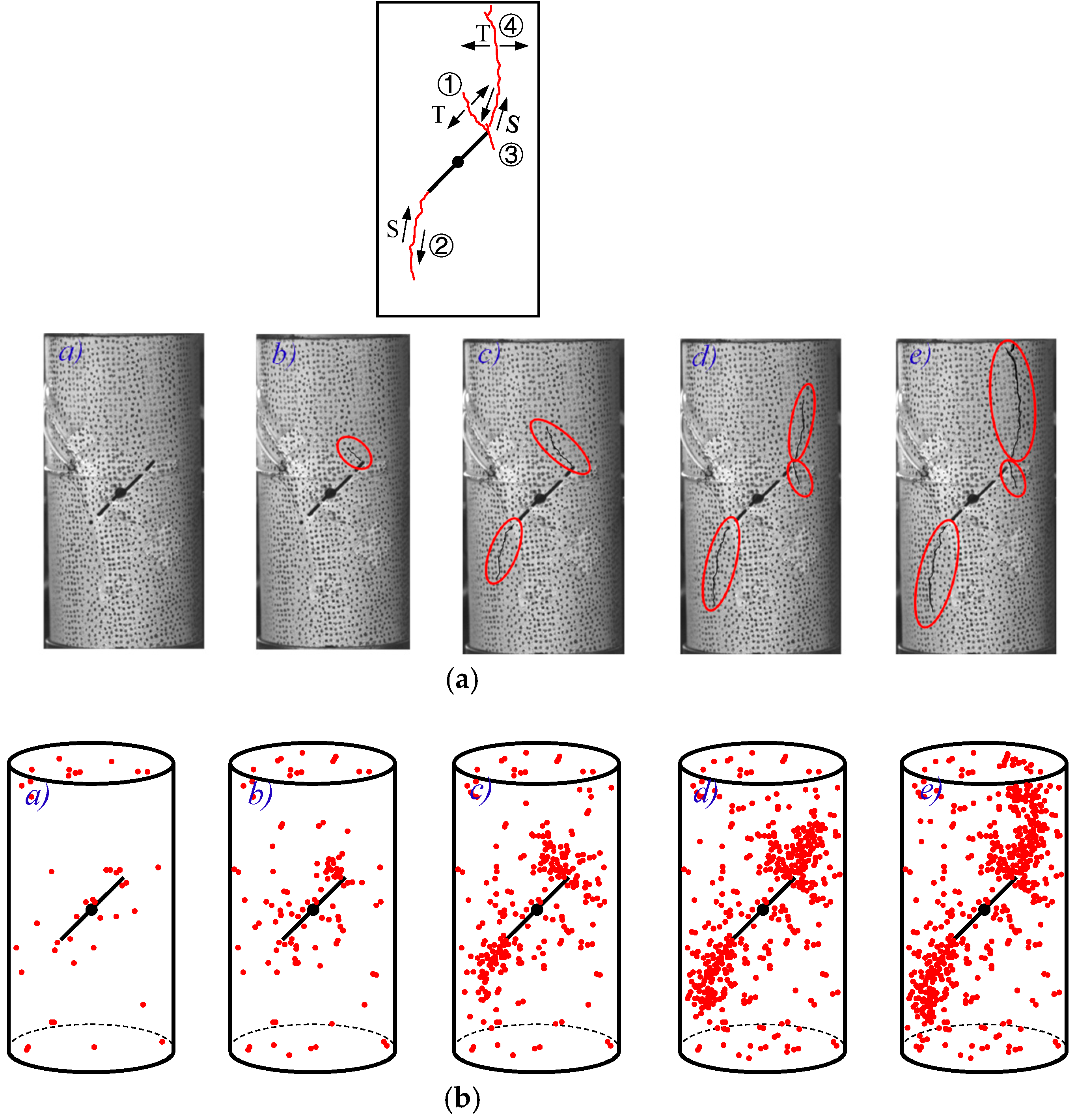 Figure 13b. During the initial loading stage, the AE events exhibited a random and scattered distribution, though concentration of the stresses led to the formation of localized micro-crack clusters near the fracture tips with no visible macroscopic cracking. When the loading progressed to point b, concentrated AE clusters appeared at the top fracture tip as wing cracks initiated and propagated in the direction perpendicular to that of the pre-existing fracture; this phenomenon resulted in a significant increase in the number of AE events. When the loading process reached point c, AE clusters began to develop at the bottom fracture tip, which indicated the beginning of macroscopic crack propagation, and the wing cracks continued to extend. During this stage, the AE events that were aligned with the direction of the top fracture revealed the development of micro-cracks in this region. At point d, many dense AE clusters formed along the direction of the fracture; this occurrence marked substantial macroscopic crack growth in which most of the AE events were concentrated along the propagation path. The final failure was characterized by complete coalescence of the top cracks while the bottom cracks remained unconnected, as well as by intensive AE activity along all the crack propagation paths.