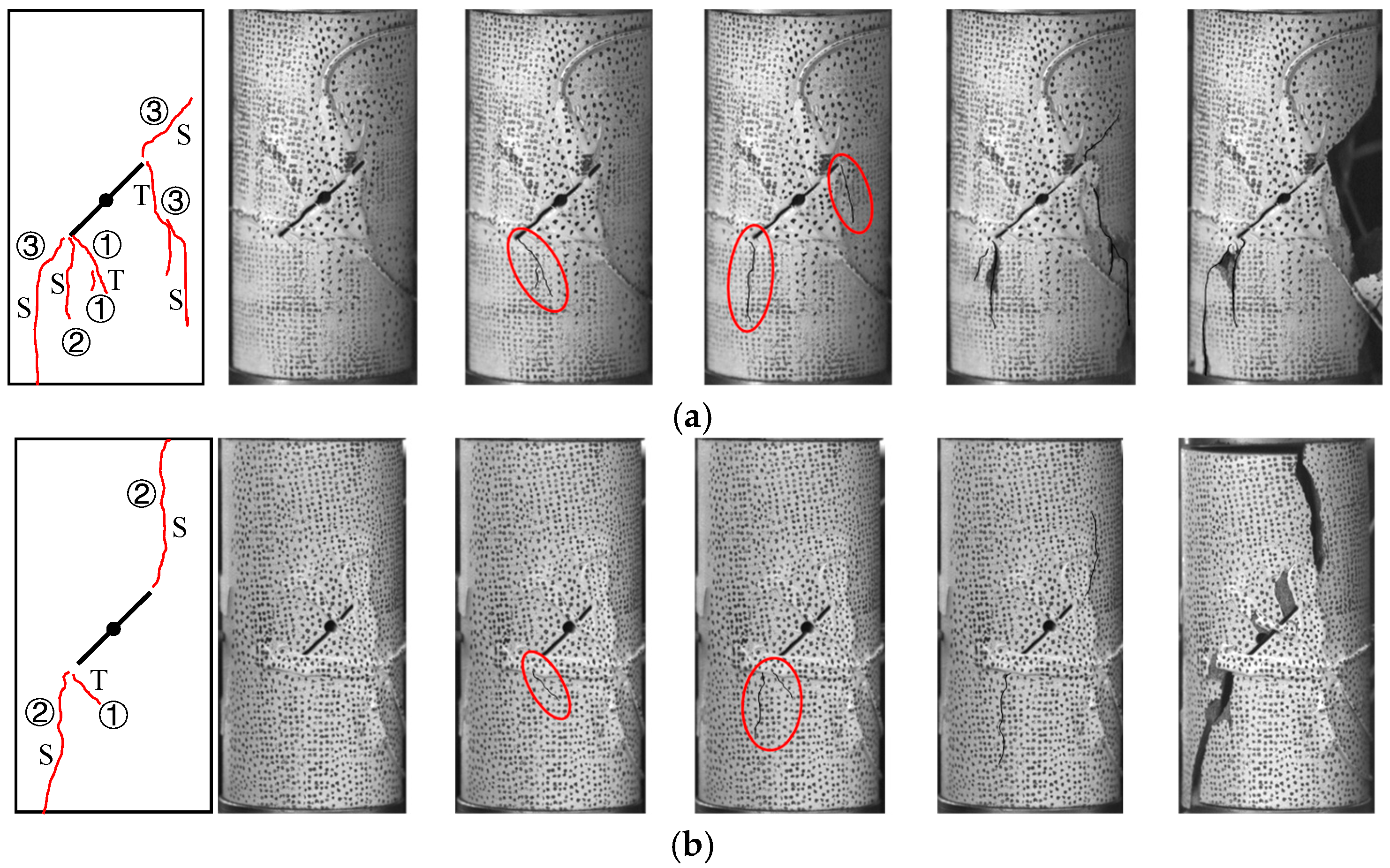 Figure 14 illustrate the surface-crack propagation processes in the single-fracture cyan sandstone specimens. During the initial loading, all three specimens developed wing cracks in the direction perpendicular to that of the pre-existing fracture and at its tips. However, these wing cracks had different orientations in the different specimens: specimens B