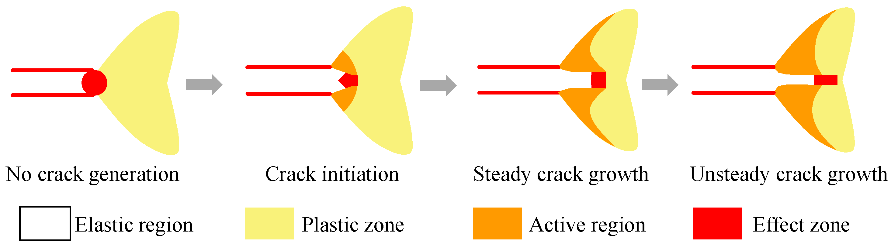 41]. The propagation and coalescence of cracks within rocks generally occur in three distinct phases. First, in the initial stress application phase, while no macroscopic crack propagation occurs, the damaged zones at the crack tips expand. Second, in the sustained loading phase, rapid crack extension occurs in the rock matrix. Third, the cracks continuously propagate until they are completely interconnected. The evolution of the crack-propagation process is depicted in
