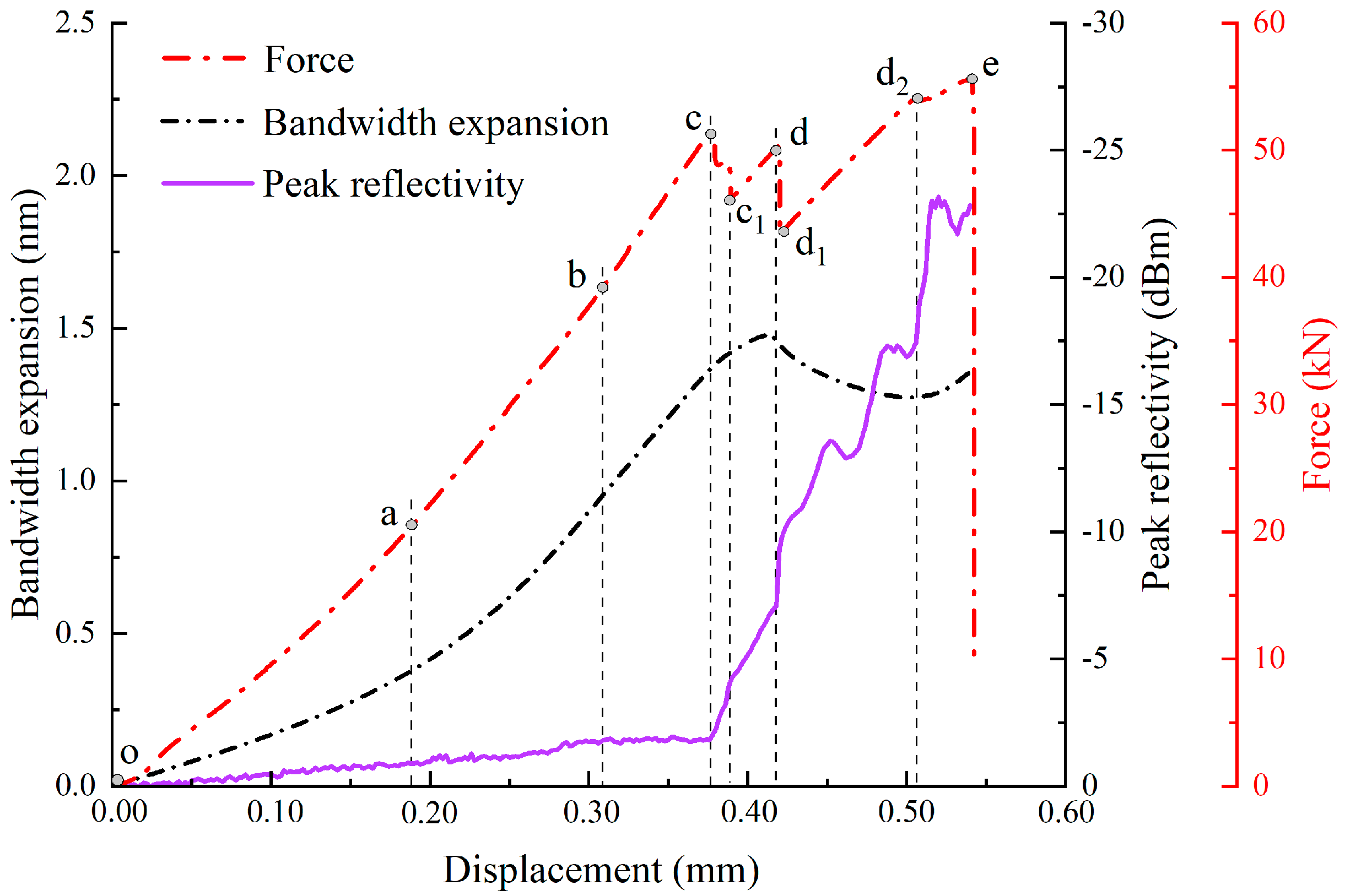 1e stage, which preceded the final failure at point e, featured step-like reductions in Δr, which revealed discontinuous fracture progression. Throughout the loading process, the slope variations in both the Δλ and Δr curves consistently aligned with the mechanical response; thus, the ability of the FBGs to characterize real-time crack evolution was validated.