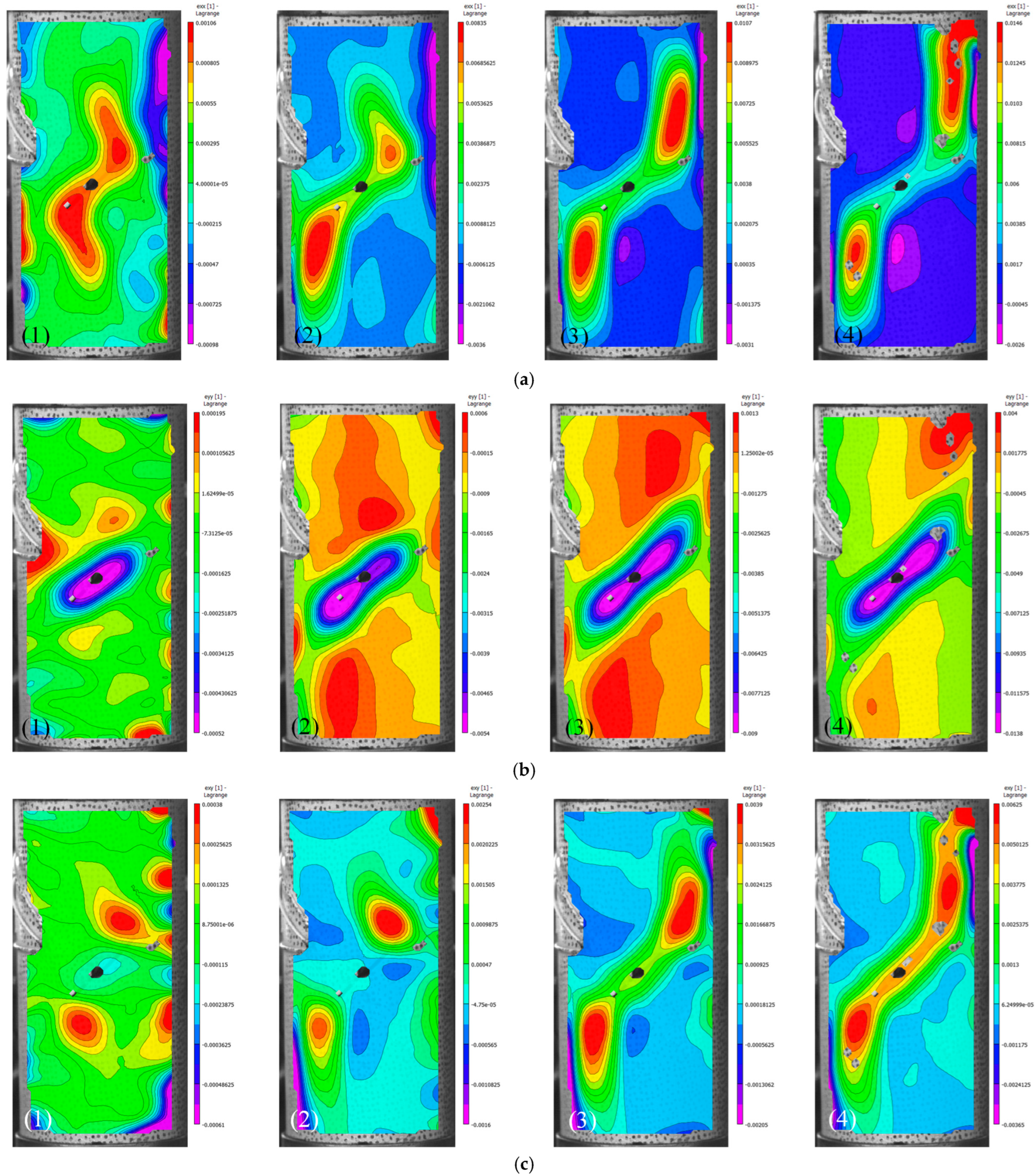 Figure 18a–c (1). The strain concentration zones in the x and xy directions were located at the crack tip and were oriented in the direction perpendicular to that of the fracture, while strain concentration zone in the y direction covered the entire fracture. This localization indicated the development of internal damage, and the deformation was concentrated in damaged zones where wing cracks were initiated in the direction perpendicular to that of the fracture, while the pre-existing crack gradually became compacted. As the load increased, the strain values in the x and xy concentration zones increased, and these zones migrated toward the crack bottom as the top wing-cracks extended. The rock deformation became discontinuous, and the process transitioned from the localized-concentration stage to the fracture-development stage, as shown in
