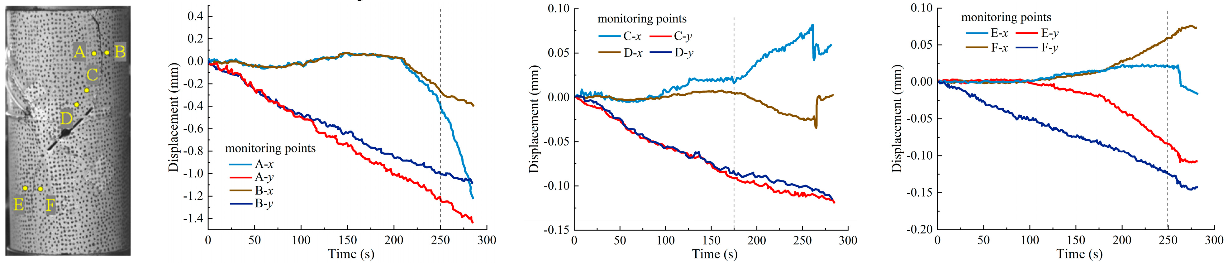 42] proposed a quantitative method for directly characterizing rock cracking behavior using DIC, comprising four key steps: measurement point selection, displacement extraction, local coordinate transformation, and relative displacement calculation. To quantitatively characterize the crack-propagation process and identify the crack types, we implemented this methodology by analyzing the relative displacement evolution at characteristic points across fracture surfaces. If the relative strain demonstrated a separation and opening tendency, tensile cracks were indicated; however, if a shear-slippage tendency was demonstrated, shear cracks were indicated. The displacement evolution curves for characteristic points are presented in