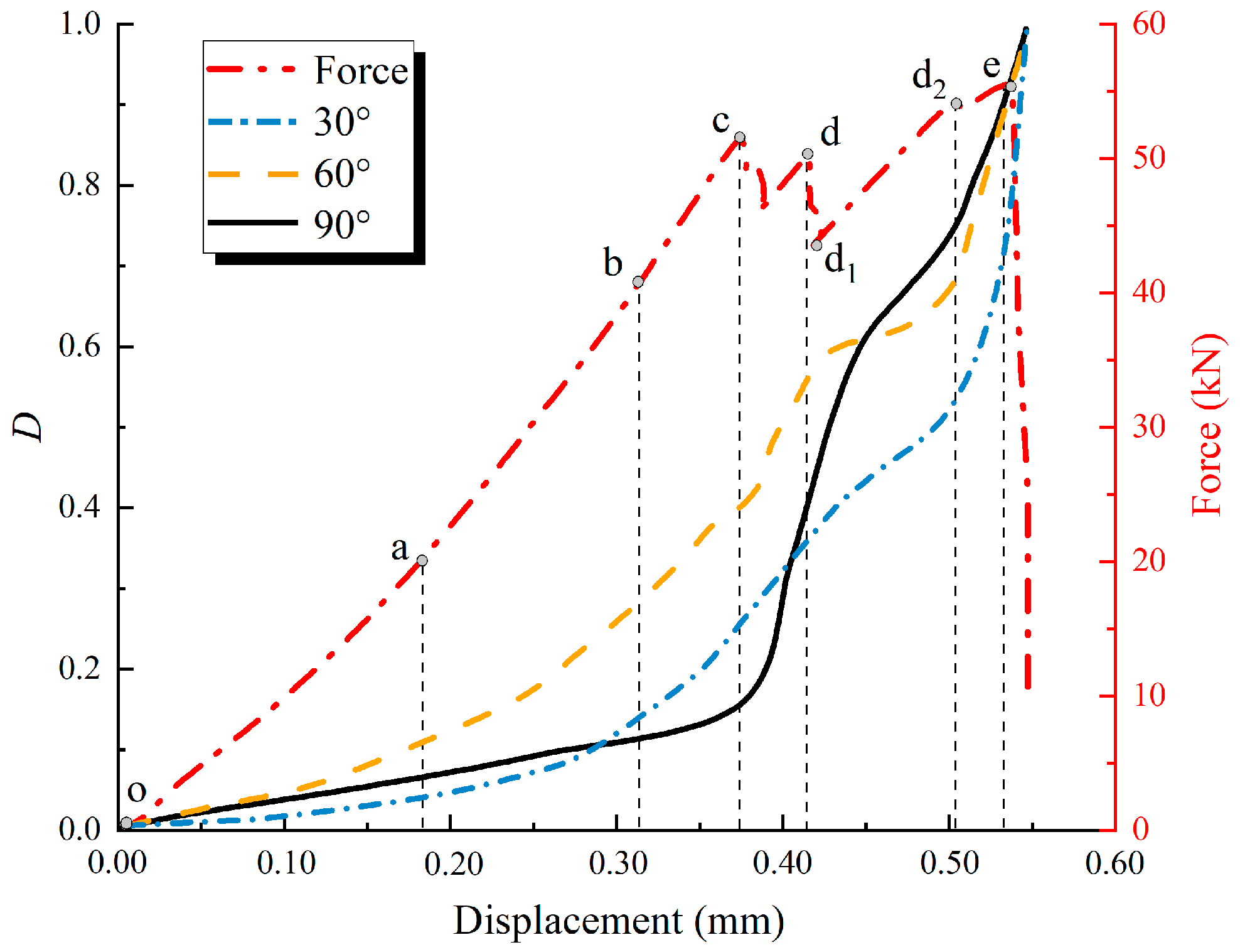 Figure 21. Under uniaxial compression conditions, the damage characteristic curves of the pre-cracked sandstone specimens monitored by FBGs can be divided into three stages: initial damage accumulation, damage acceleration, and final failure. During the initial damage accumulation stage (the ob stage), the damage variable, which was obtained by the FBGs mounted at different angles, remained low (with values of 0.13, 0.24, and 0.11 for the 30, 60, and 90° FBGs, respectively). These low values reflected the gradual accumulation of micro-damage caused by crack compaction and elastic deformation. In the damage acceleration stage (the bc stage),