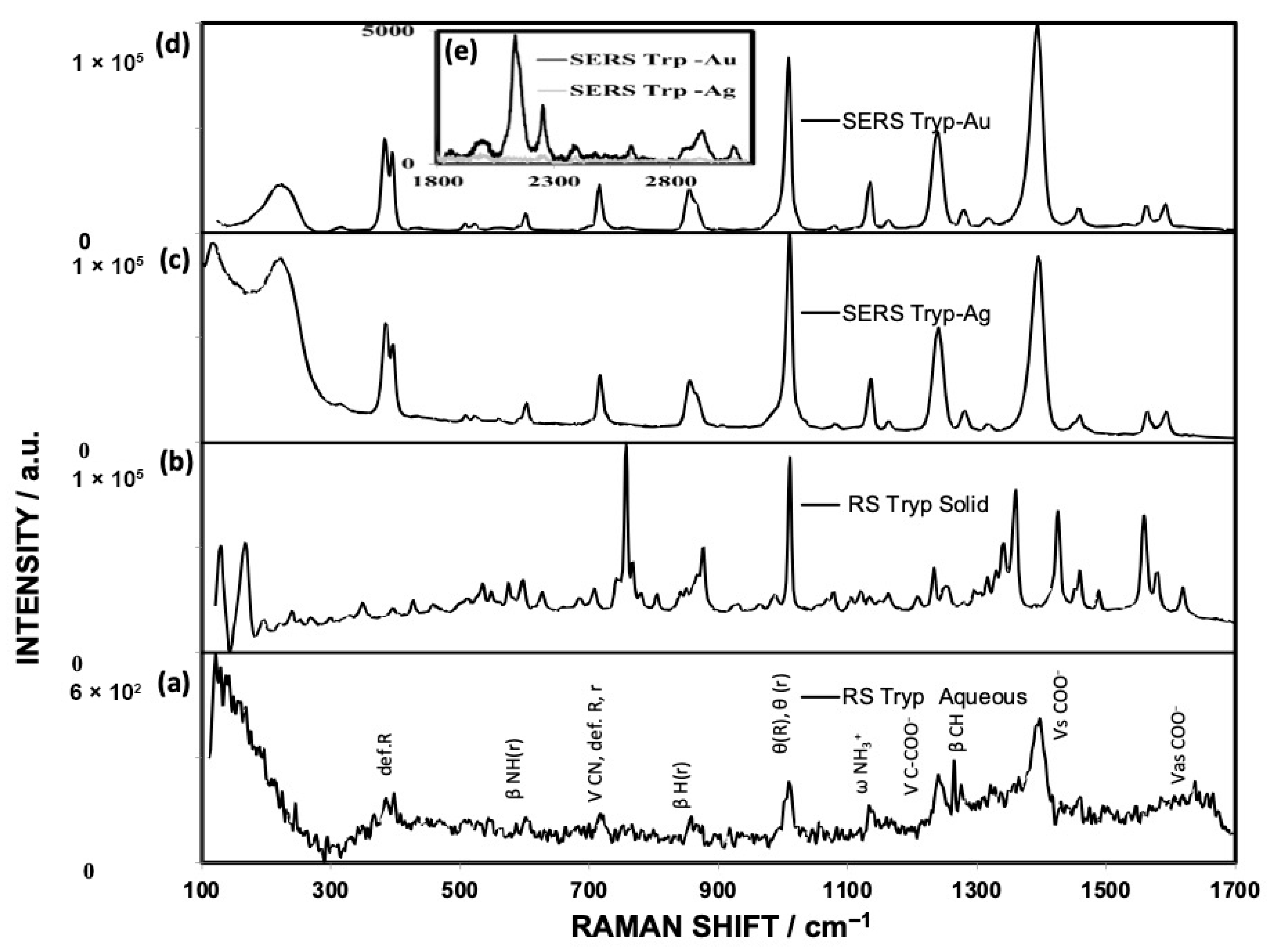 - Hugh, C.; Chena, Y. Raman scattering of L-tryptophan enhanced by surface plasmon of silver nanoparticles: Vibrational assignment and structural determination. J. Raman Spectrosc. 2009, 40, 150–156. [Google Scholar]