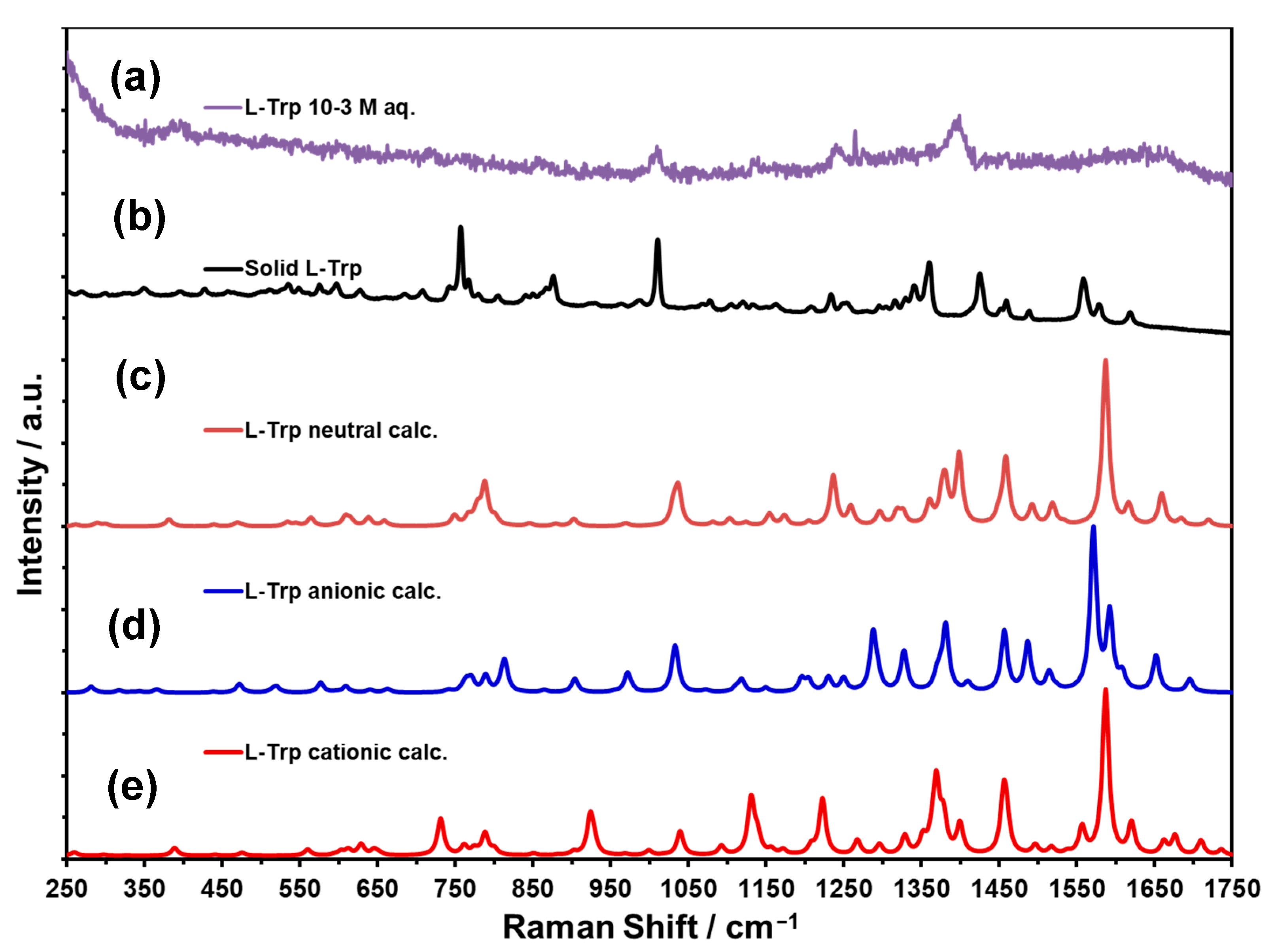 - Aliaga, A.E.; Osorio, I.; Leyton, P.; Garrido, C.; Caniulefa, C.; Diaz, G.; Celis, F.; Diaz, G.; Clavijo, E.; Gomez, S.; et al. Surface-enhanced Raman scattering study of L-tryptophan. Raman Spectrosc. 2009, 40, 164–169. [Google Scholar] [CrossRef]