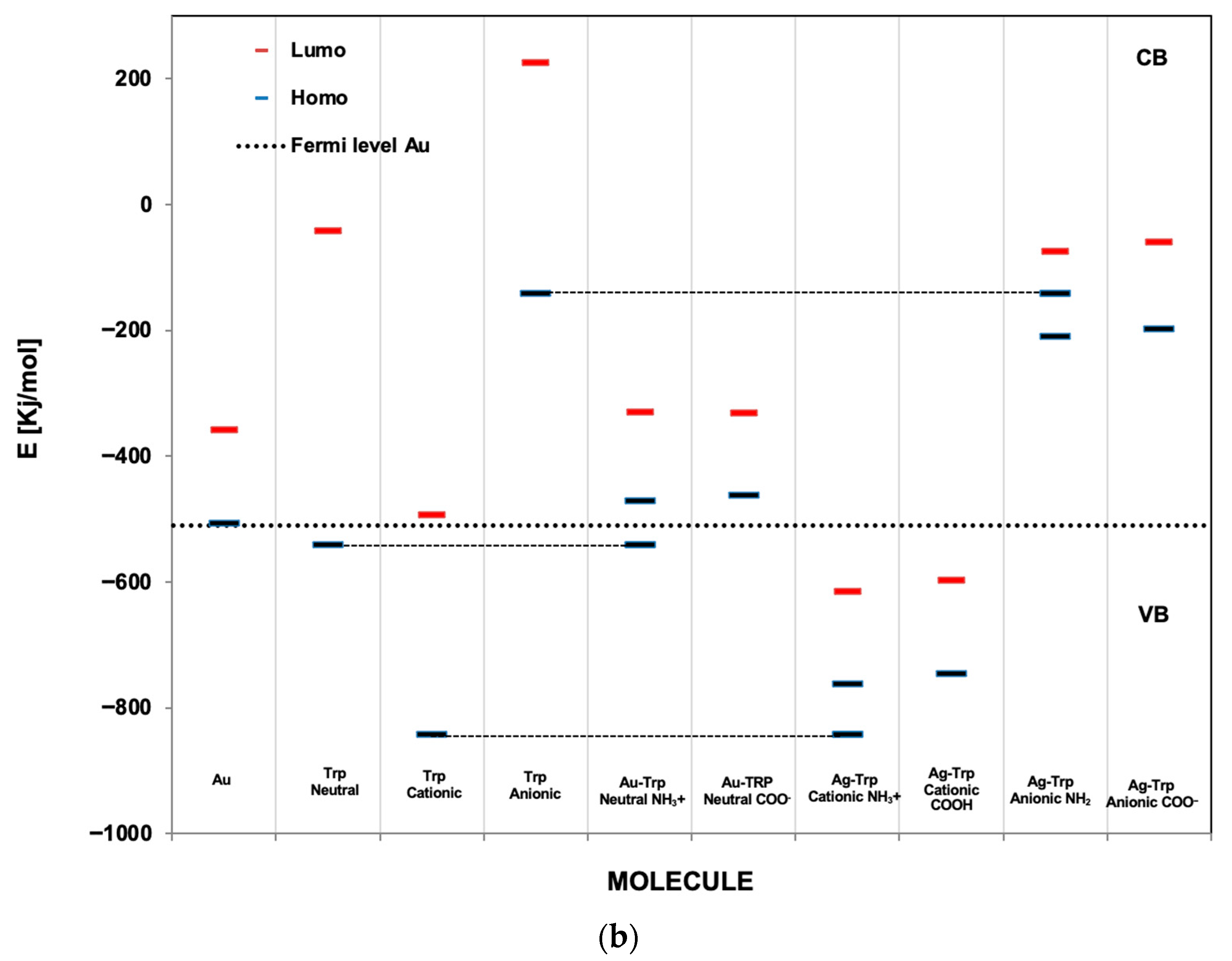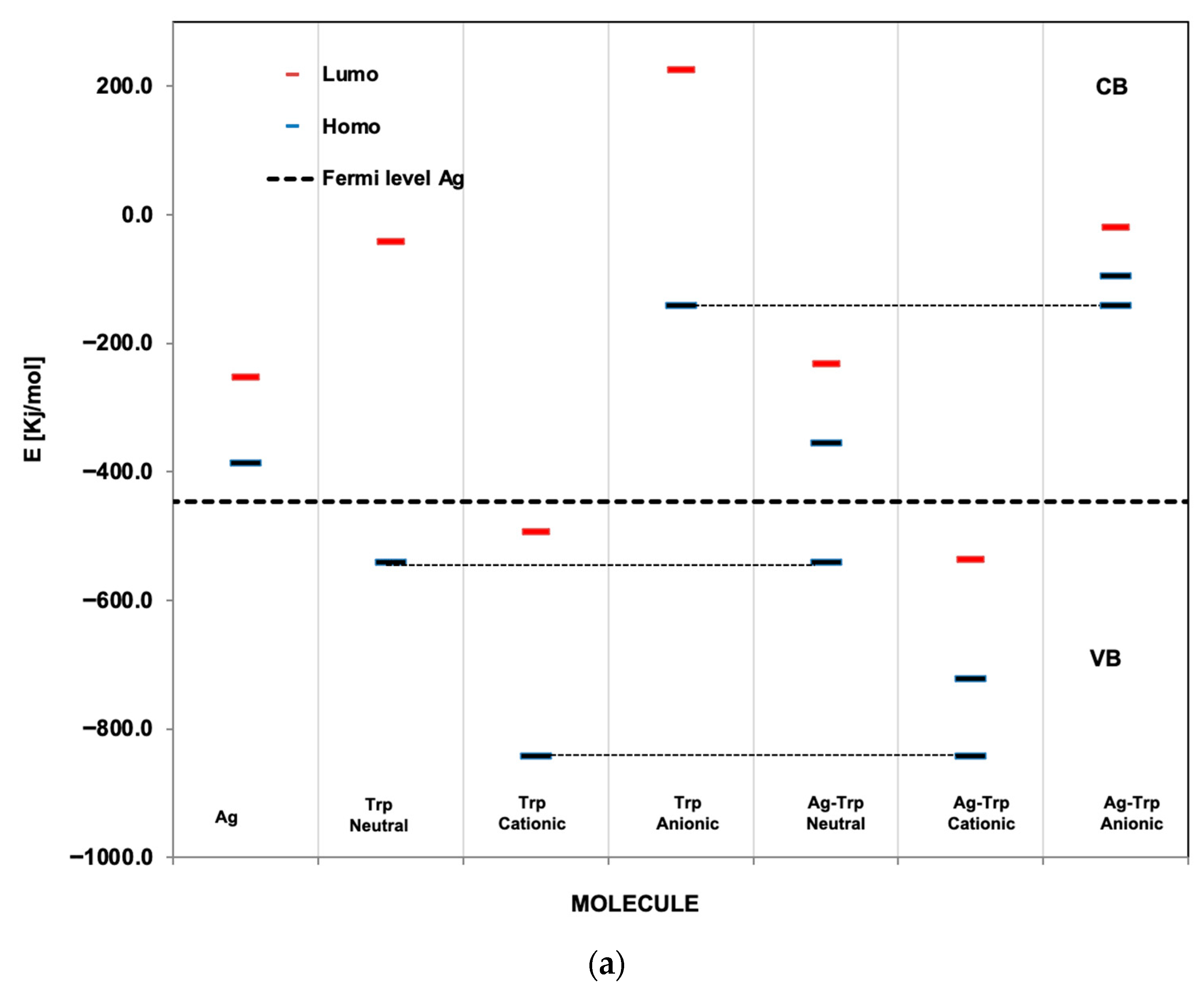 - Bhattacharya, S.; Vyas, N.; Ojha, A.K.; Dasgupta, S.; Roya, A. Surface-enhanced Raman measurements and DFT calculations for L-tryptophan of varying pH in silver sol. J. Raman Spectrosc. 2012, 43, 718–723. [Google Scholar] [CrossRef]