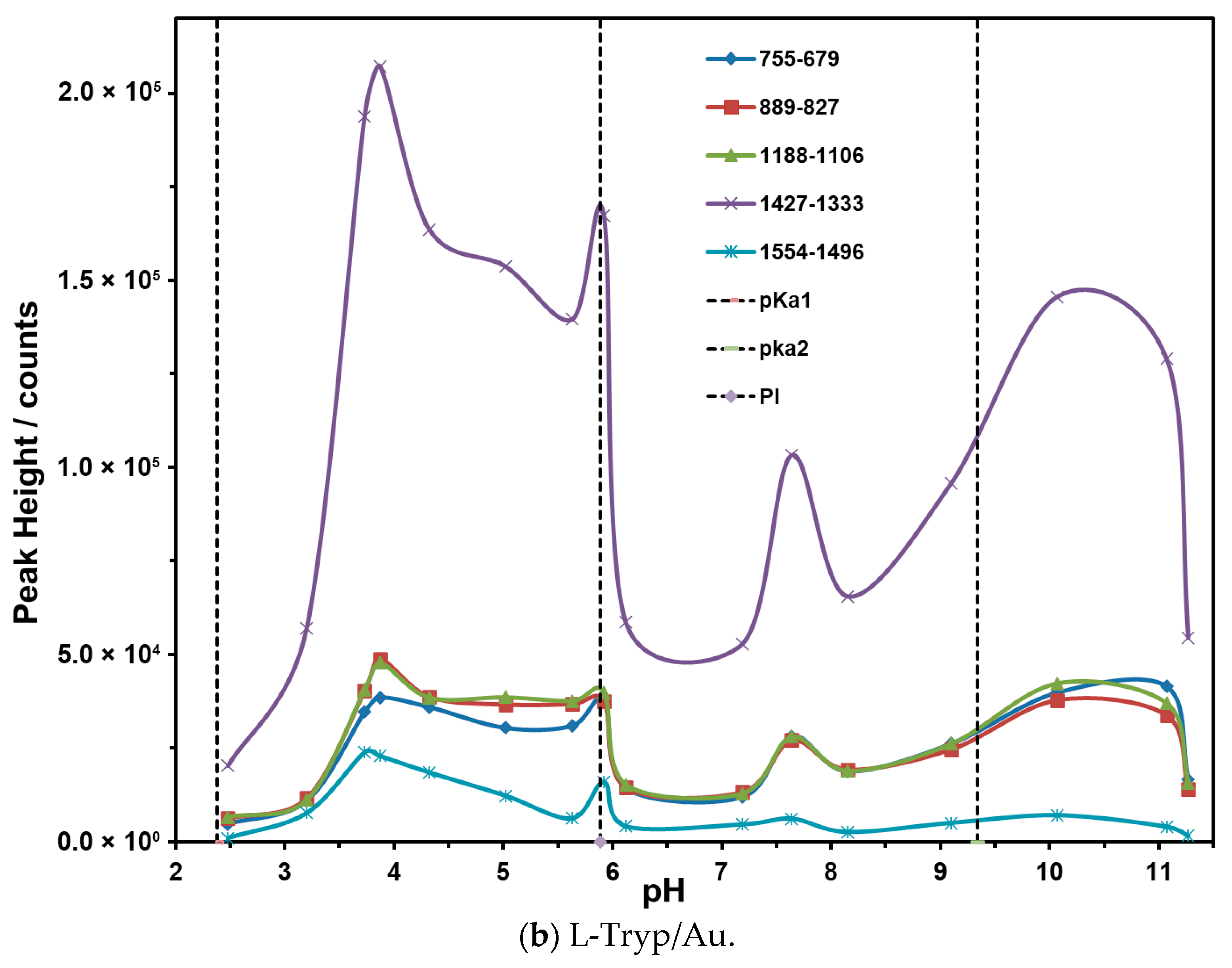 3.5. Effect of pH on Vibrational Bands of L-Tryp on Ag and Au Colloids