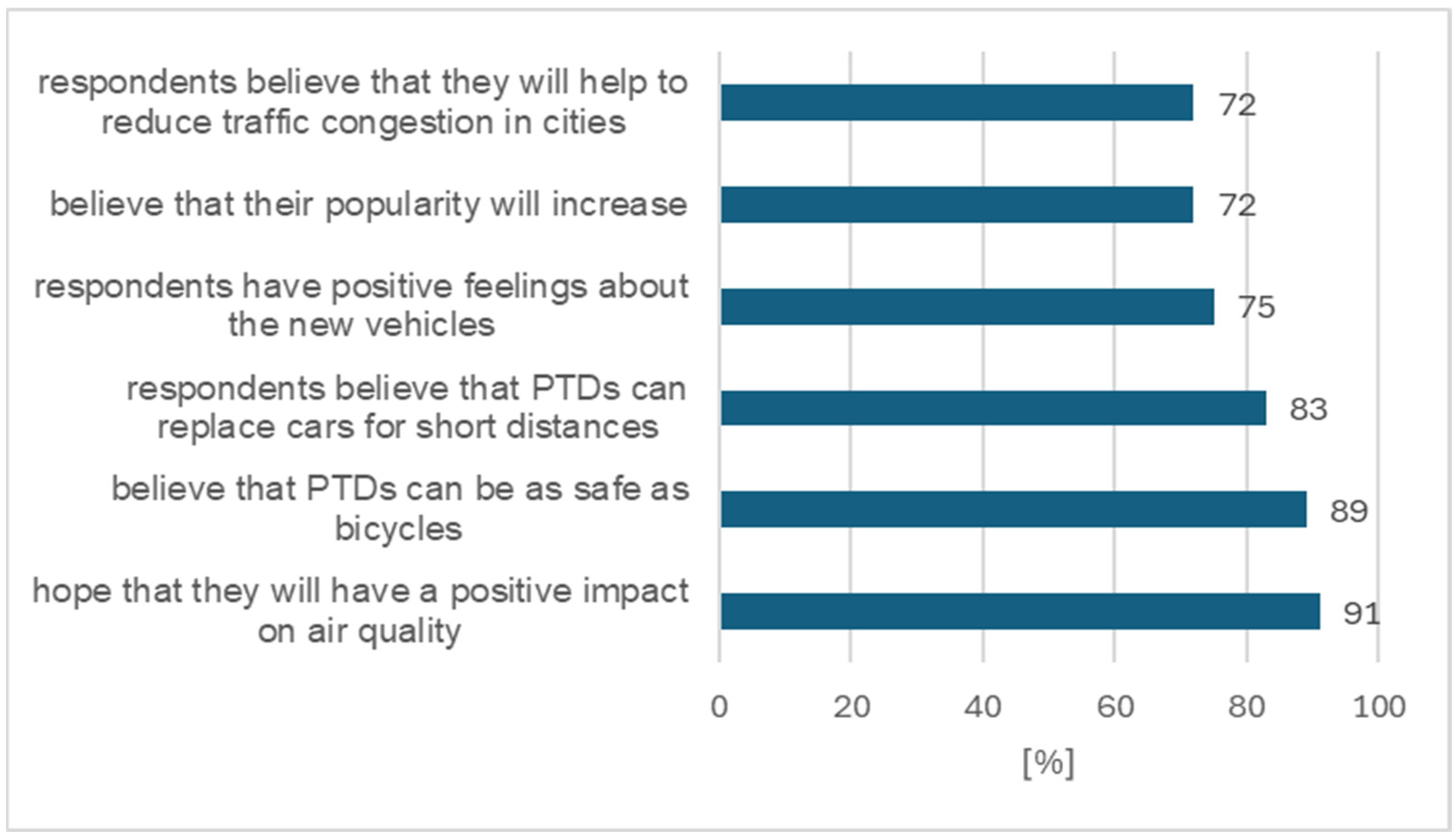 56]. Micromobility was associated with the use of so-called PMDs, i.e., lightweight vehicles designed to assist in traveling short distances, which in transport also most often constituted the first or last leg of the journey in order to reach the destination faster [