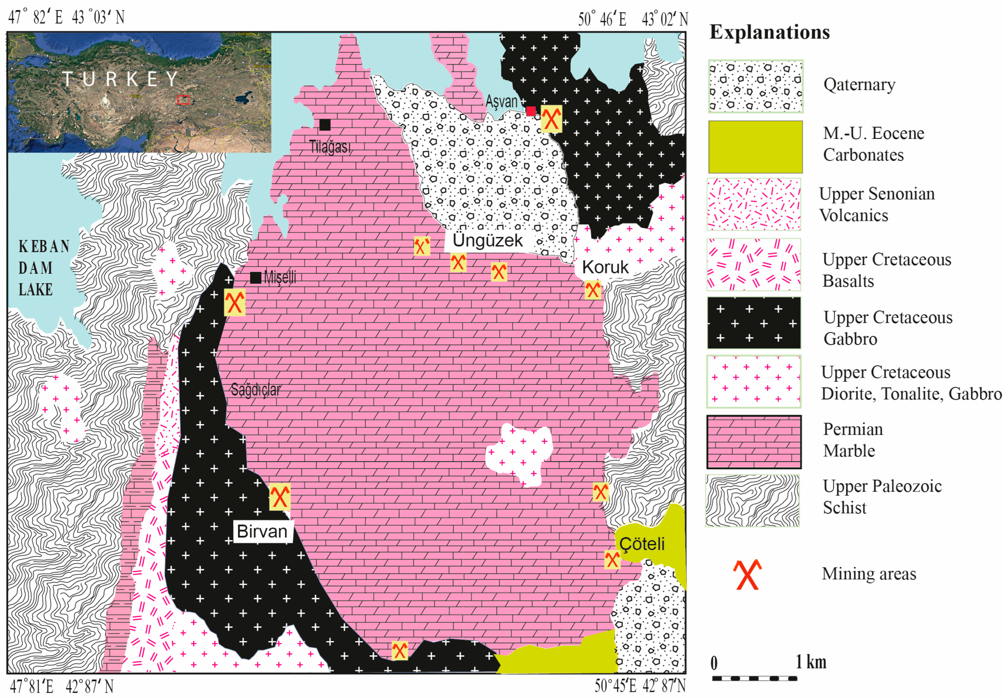- Bingöl, A.F. Elazığ-Pertek-Kovancılar (Doğu Toroslar) yöresinin jeolojisi. In Toros Jeolojisi Uluslararası Sempozyumu, Tebliğler; Munzur Üniversitesi: Ankara, Turkey, 1984. [Google Scholar]