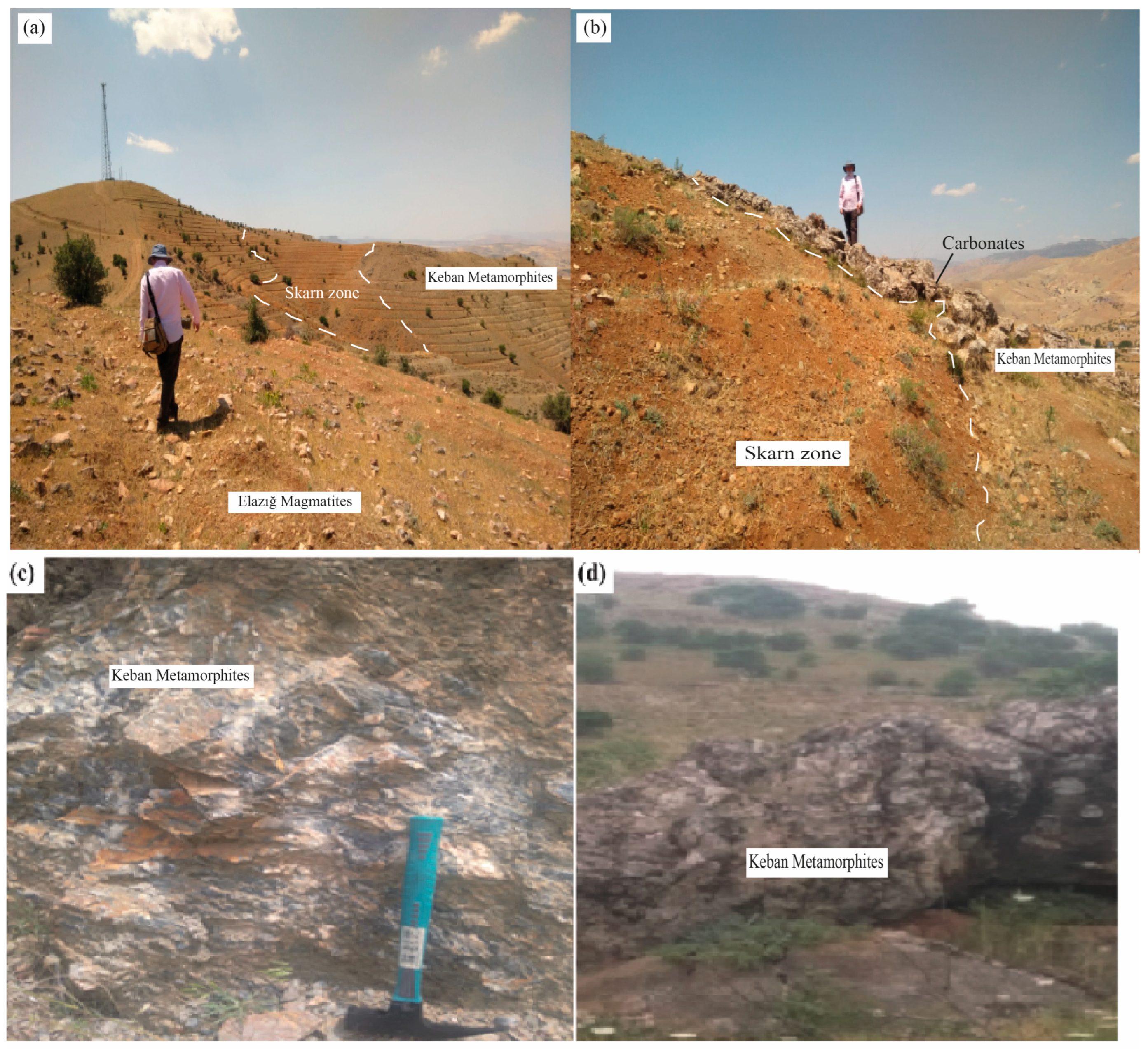 - Skarns develop along contacts between dioritic and granitic plutonic rocks and carbonate rocks, forming two main zones: a narrow endoskarn and a more extensive exoskarn. Endoskarns exhibit distinct mineralogical zoning, including pyroxene–garnet, pyroxene–scapolite, and epidote–garnet assemblages, whereas scapolite occurs in both endoskarn and exoskarn zones.