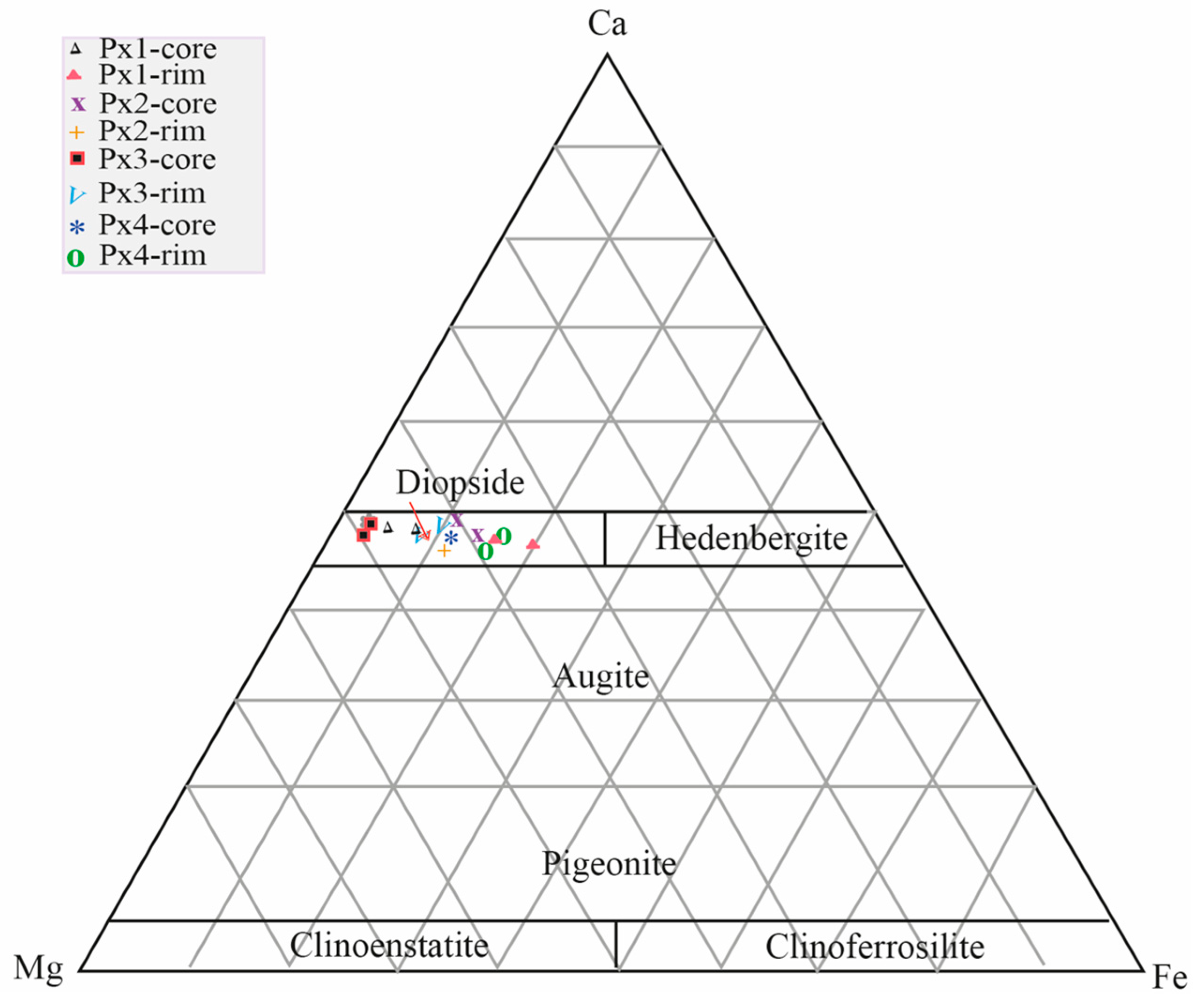- Pyroxenes are predominantly composed of diopside, with cores enriched in SiO2 and MgO and rims enriched in FeO and CaO, reflecting magmatic differentiation and metasomatic processes. Minor serpentinized olivine within endoskarns is attributed to localized magnesium enrichment.