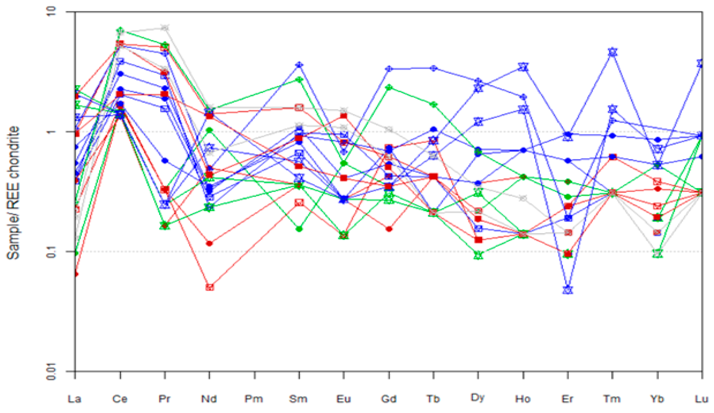 | ΣLREE | 2.06 | 1.51 | 1.52 | 3.92 | 2.58 | 3.34 | 2.27 | 6.70 | 1.62 | 2.01 | 2.08 | 2.07 | 8.73 | 6.22 | 2.52 | 2.27 | 3.24 | 5.91 | 5.59 | 8.29 |