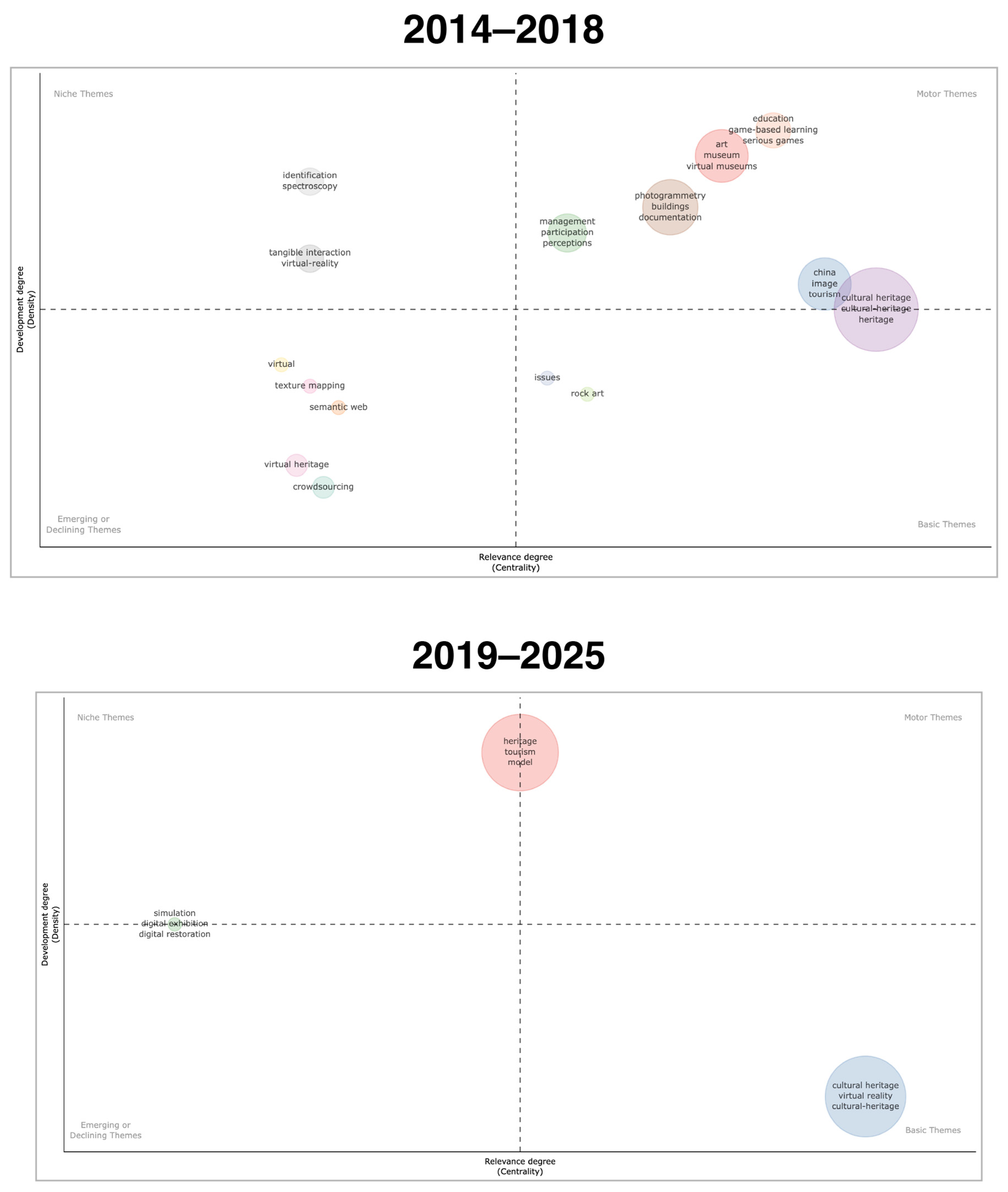 - Middle tier—Application scenarios: Represented by Clusters 1 and 4, this layer centers on concrete CH contexts and practices, including heritage tourism, museum exhibitions, and educational communication.