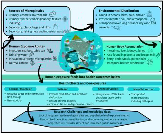 Despite growing research, the mechanisms by which MPs affect human health remain poorly understood. Studies show that MPs can accumulate in organs such as the intestines, liver, kidneys, lungs, placenta, and breast milk, crossing biological barriers and disrupting physiological functions. MPs are increasingly recognised as carriers of substances with immunotoxic, carcinogenic, and endocrine-disrupting properties, which may interfere with immune signaling, hormonal regulation, and cellular homeostasis [9,17]. In vitro and in vivo studies suggest links to DNA damage, oxidative stress, inflammation, and metabolic disorders, potentially contributing to chronic diseases including cardiovascular, neurodegenerative, and oncological conditions [9,18]. Of particular concern are the effects of MPs on immune and metabolic functions, where they may modulate immune responses and disrupt physiological homeostasis [19]. Microplastics continue to pose a global environmental threat with largely unexplored consequences for human health (Figure 1). Their complexity, diverse sources, detection challenges, and the absence of standardised risk assessment protocols underscore the urgent need for further research and coordinated international action.