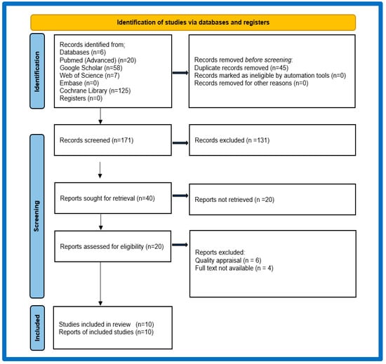 A total of 216 relevant publications were identified. After removing 44 duplicate articles, the remaining studies underwent a detailed analysis of titles and abstracts, resulting in the selection of 40 articles. Their eligibility and methodological quality were then assessed, resulting in the final inclusion of 10 publications in the review (Figure 2). The final selection of ten publications was based on their thematic alignment with the objectives of the review, the availability of original data on the presence of microplastics in human tissues or body fluids, and the fulfilment of rigorous methodological criteria, including clarity of study design, robustness of statistical analysis, and reproducibility of results, in accordance with the evaluation criteria described above.