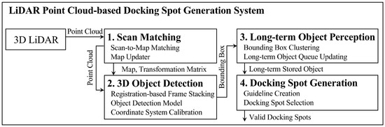 We propose a LiDAR point-based DSG (LP-DSG) system to generate autonomous docking spots for USVs in berthing environments. As shown in Figure 1, LP-DSG consists of four key stages: scan matching, 3D object detection, long-term object perception (LOP), and DSG.