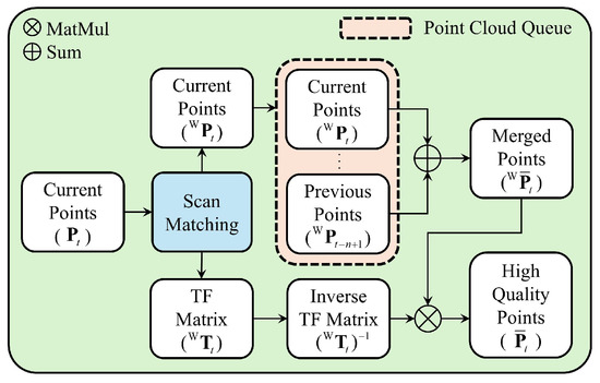 Process for the generation of high-quality point cloud using RFS. One of scan matching output is stored in the point cloud queue for each frame. The merged point cloud is generated by combining previously stored point clouds in the point cloud queue. Subsequently, the other of scan matching output is inverted and applied to , generating within the sensor coordinate system.