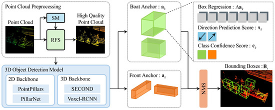 As shown in Figure 4, the high-quality point cloud obtained through the preprocessing stage is cropped to a region of interest (ROI) with dimensions , which is then divided into voxels of size . In the case of using a 2D backbone, the height of the region is set equal to . Each voxel is fed into the object detection model, which outputs a feature map of size . Each pixel in this feature image is assigned anchors, resulting in a total of anchors, which form the anchor set :