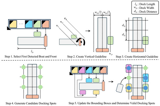 In Step 4, the intersection of all elements in with and is designated as candidate docking spots. Step 5 then initiates an object matching process to determine the occupancy of each docking spot. When is updated, if the center of a Boat’s bounding box stored in is located on a candidate docking spot, that spot is marked as occupied. An occupied docking spot is no longer available, and the non-occupied docking spots become valid docking spots.