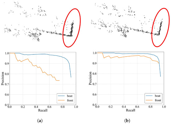 RFS produces a higher object detection performance than FS, another multi-frame model. This improvement is attributed to the multi-frame alignment process in RFS, which refines the point cloud, making it more suitable for object detection. Figure 12 visualizes the point cloud datasets generated by applying FS and RFS to the experimental model and shows the class-wise precision-recall (PR) curve results for each model. Notably, in the Front object region, indicated by the red ellipse, the FS data sample produces an unstable object shape. In contrast, with RFS, the object shape is more stable due to precise frame alignment. This is a critical factor in detecting relatively small objects such as the Front.