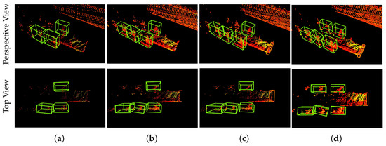 Visualization of the inference results for the experimental model: (a) baseline (b) baseline with FS (c) baseline with RFS (d) the ground truth. Only bounding boxes with a class confidence score higher than 0.7 are displayed. Point colors represent LiDAR intensity values using a rainbow colormap.