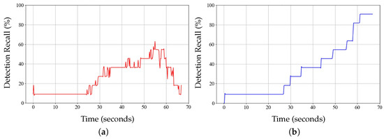 To evaluate the effectiveness of long-term perception and object management, we compare the detection recall (DR) with and without LOP. Figure 14 presents the DR over time, representing the detected objects as a percentage of the total number of actual objects in Scenario 3 of Figure 10. When LOP is not employed, the DR gradually increases over time but starts to decline after reaching 60% (Figure 14a). This decline can be attributed to objects moving out of the LiDAR FOV. In addition, due to noise in the real-world environment, the DR fluctuates during the detection process. In contrast, when LOP is used, the DR steadily increases over time (Figure 14b). This is because LOP retains object information even when they move out of the LiDAR FOV. As a result, a DR of approximately 90% is achieved in Scenario 3, contributing to the stability of DSG.