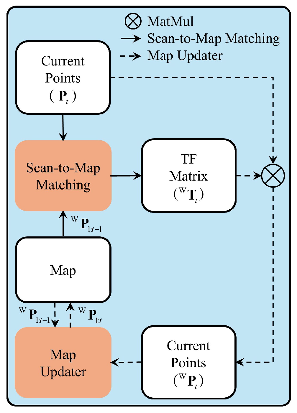 NDT is used as a scan-to-map matching technique. NDT partitions the point cloud into voxel spaces and models them as normal distributions, producing an optimal transformation matrix that minimizes the distributional differences between two LiDAR scans or between a LiDAR scan and a map. This process is used to generate the map. In LP-DSG, NDT is employed to match the LiDAR scans with the map to ensure stable map generation.