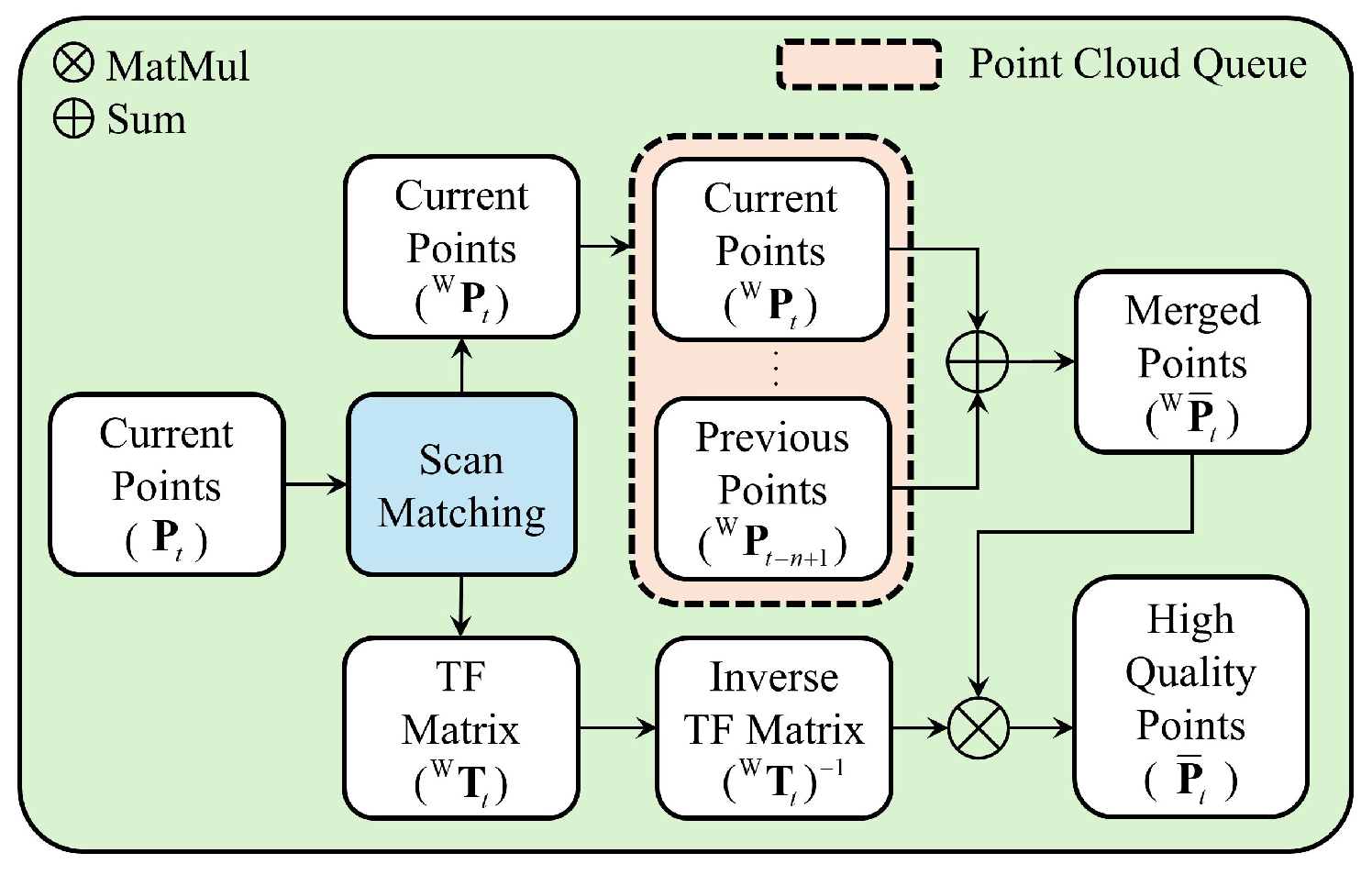 Figure 11a), while the second dataset was generated by applying frame stacking (FS) to create high-quality point cloud data. FS accumulates point clouds from previous frames in the current frame to produce a merged point cloud, without a registration process. The third dataset was constructed by registering and merging five consecutive frames of raw point cloud data, producing high-quality point cloud data using RFS (