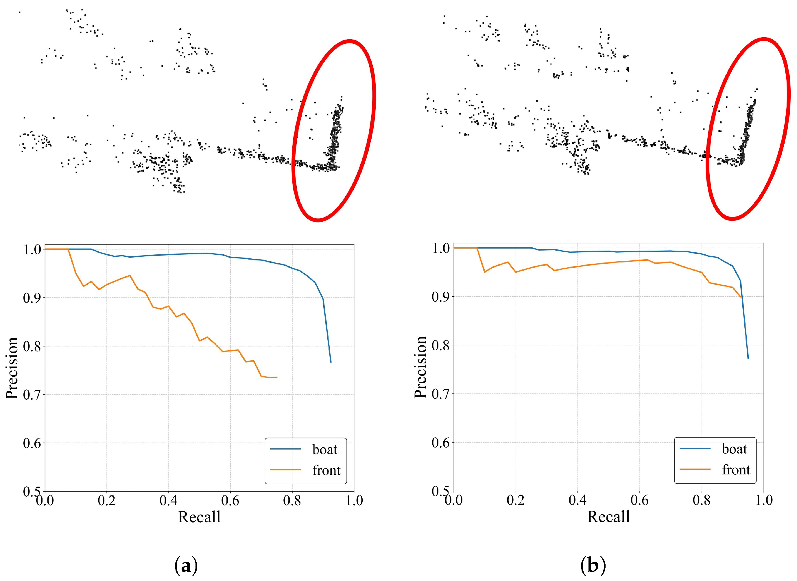 Figure 12 visualizes the point cloud datasets generated by applying FS and RFS to the experimental model and shows the class-wise precision-recall (PR) curve results for each model. Notably, in the Front object region, indicated by the red ellipse, the FS data sample produces an unstable object shape. In contrast, with RFS, the object shape is more stable due to precise frame alignment. This is a critical factor in detecting relatively small objects such as the Front.