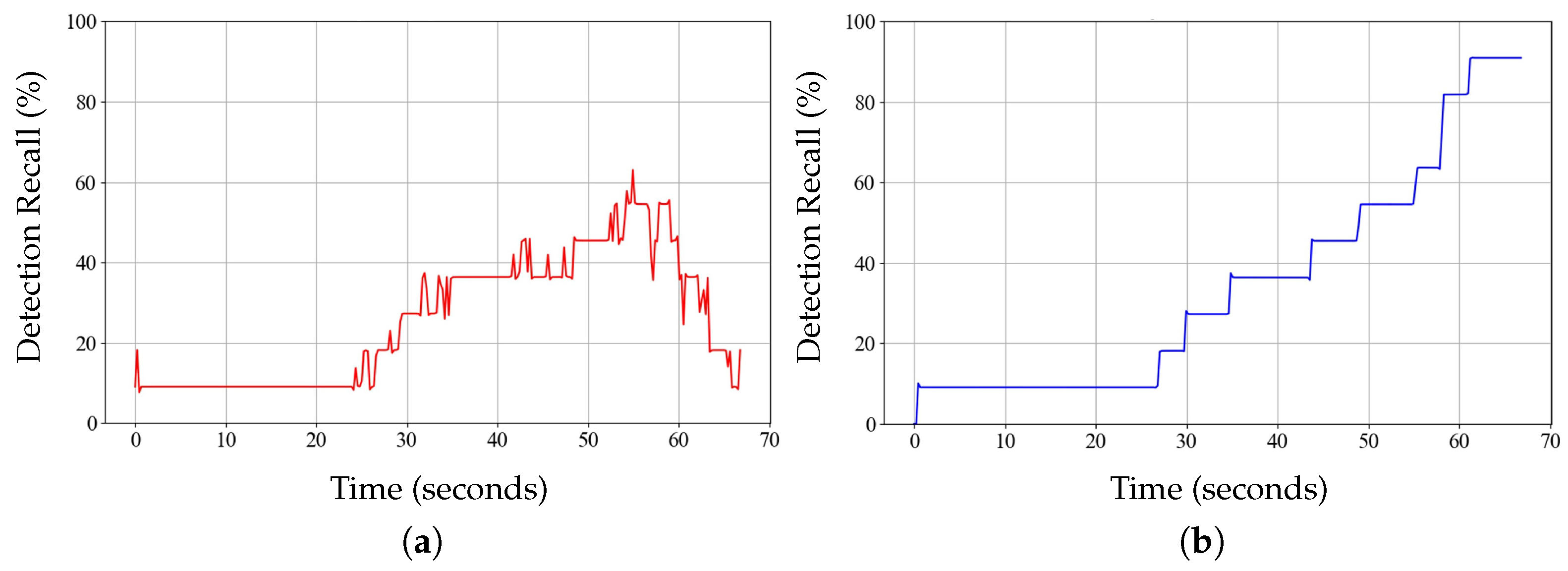 Figure 14 presents the DR over time, representing the detected objects as a percentage of the total number of actual objects in Scenario 3 of