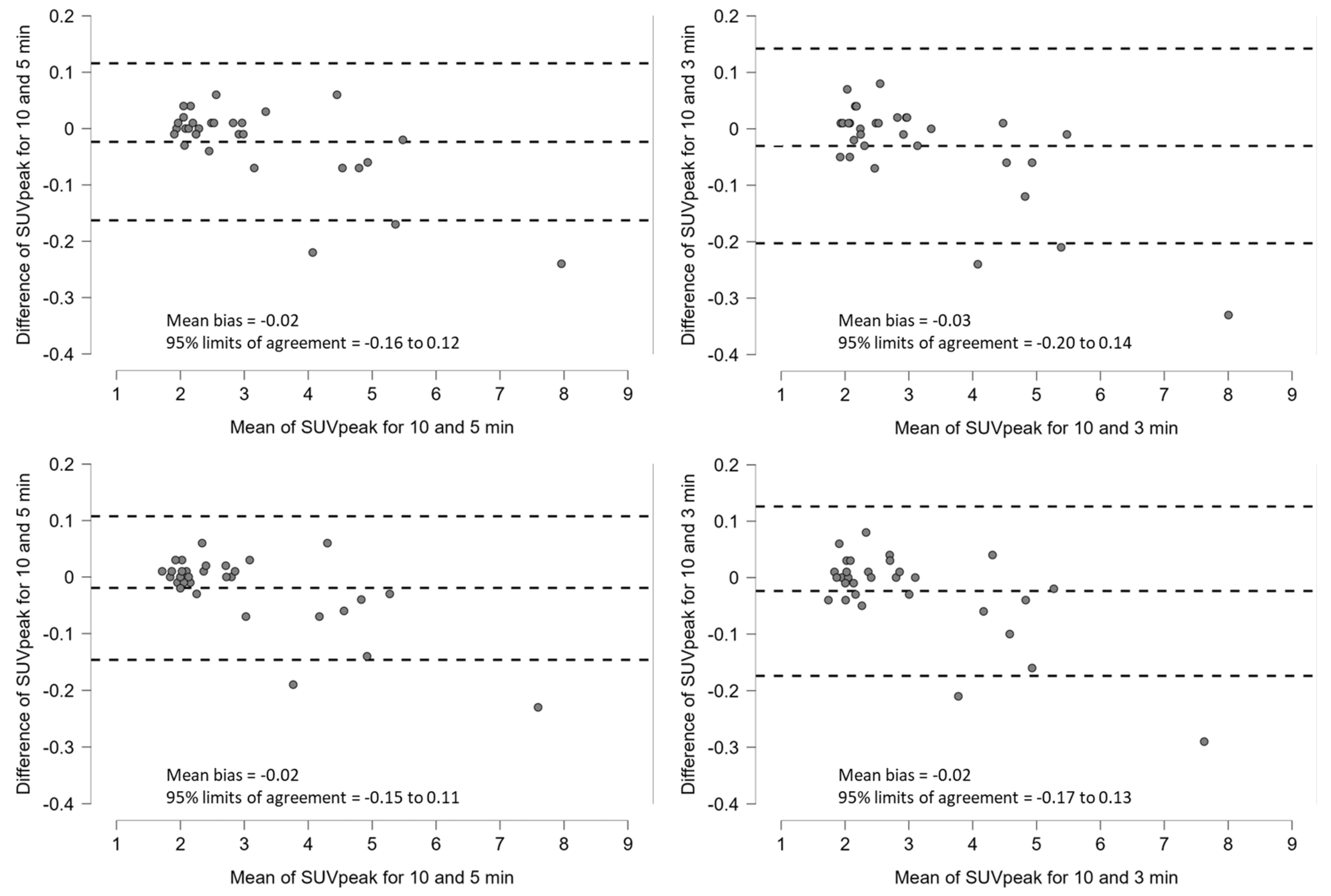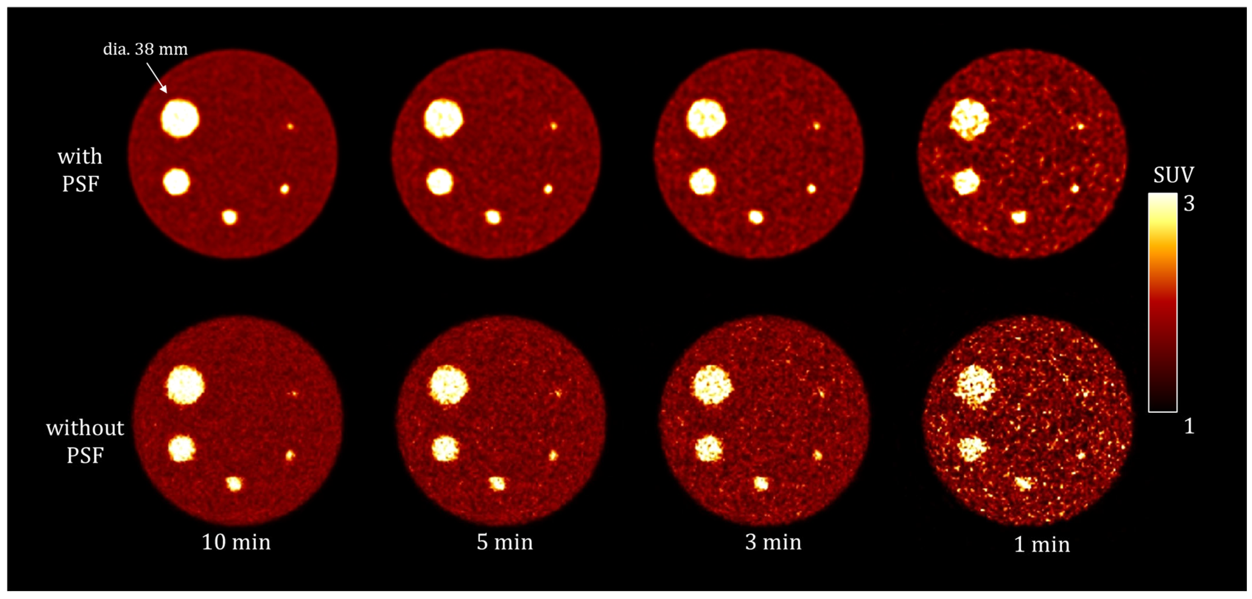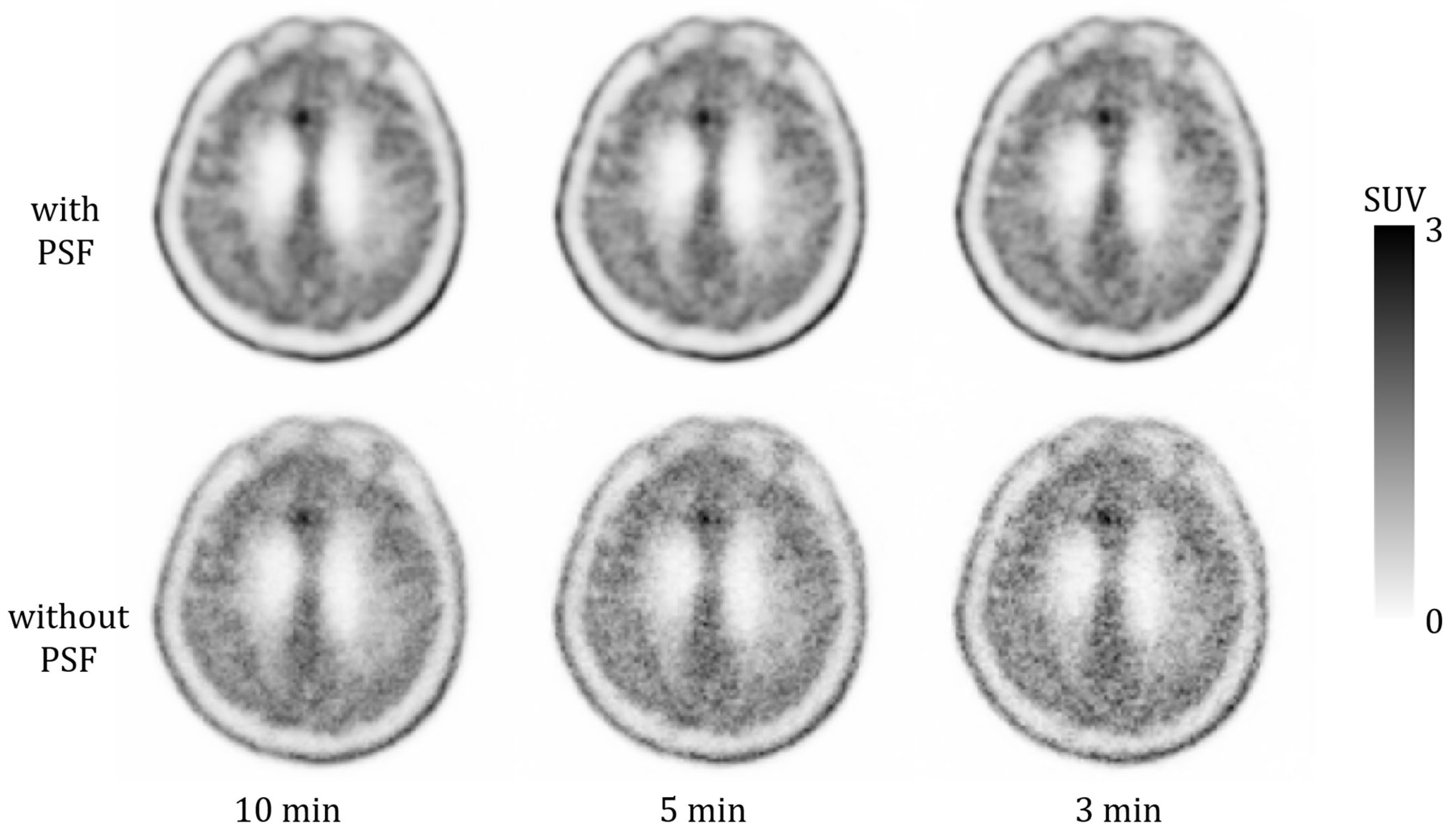 - Reconstruction with PSF: Ordered subset expectation maximization algorithm with PSF correction and time-of-flight (TOF) technique using five iterations and five subsets.
