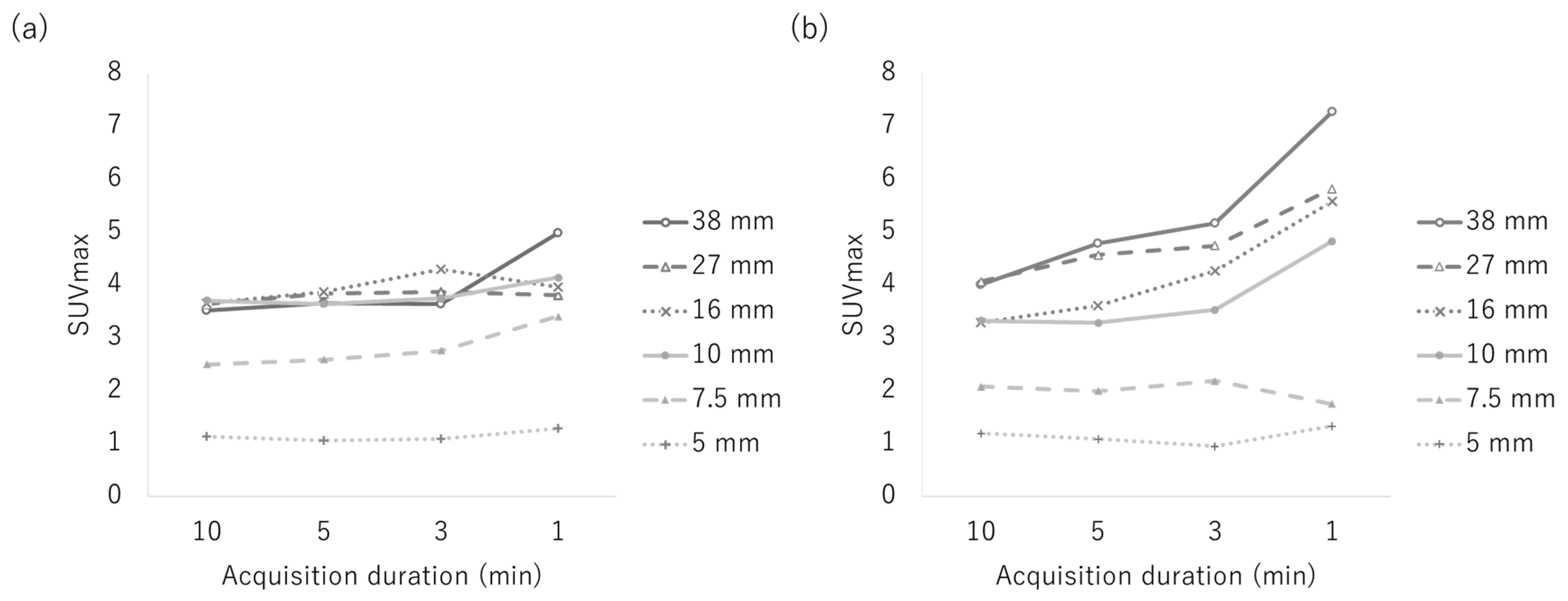 - Akamatsu, G.; Ikari, Y.; Nishida, H.; Nishio, T.; Ohnishi, A.; Maebatake, A.; Sasaki, M.; Senda, M. Influence of statistical fluctuation on reproducibility and accuracy of SUVmax and SUVpeak: A phantom study. J. Nucl. Med. Technol. 2015, 43, 222–226. [Google Scholar] [CrossRef] [PubMed]