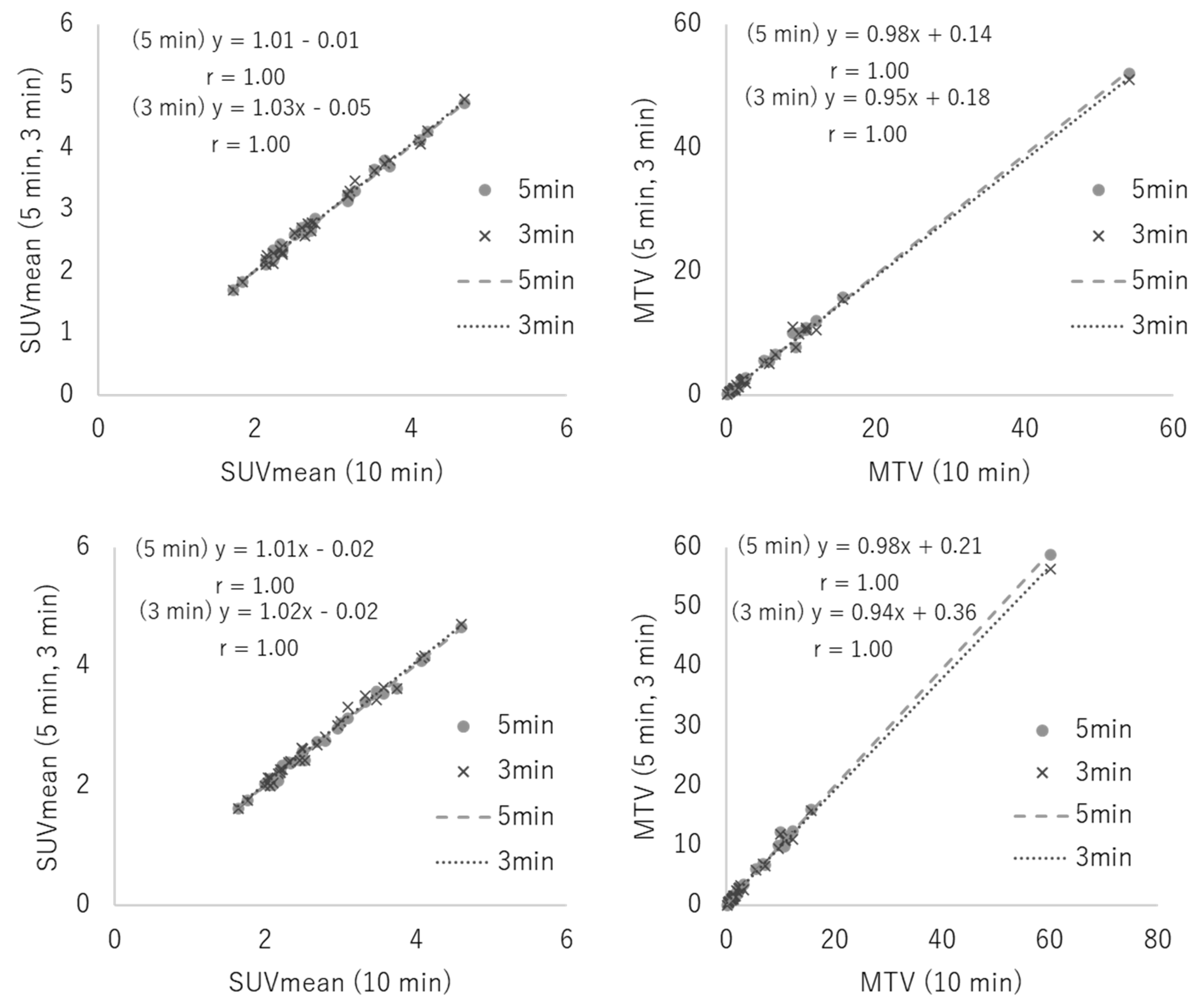 - Morimoto, M.; Kudomi, N.; Maeda, Y.; Kobata, T.; Oishi, A.; Matsumoto, K.; Monden, T.; Iwasaki, T.; Mitamura, K.; Norikane, T.; et al. Effect of quantitative values on shortened acquisition duration in brain tumor 11C-methionine PET/CT. EJNMMI Phys. 2021, 8, 34. [Google Scholar] [CrossRef] [PubMed]