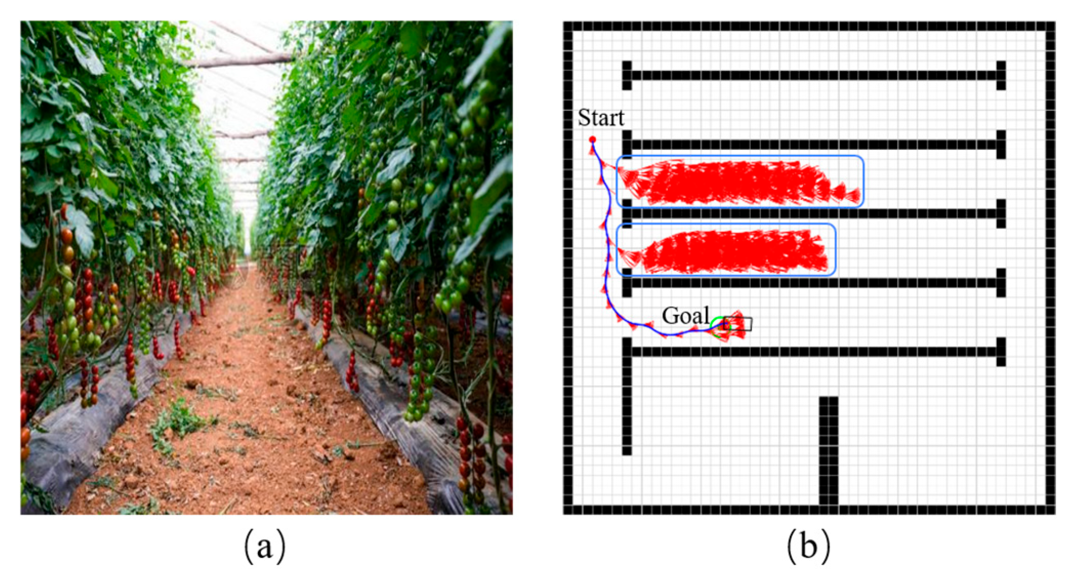 5]. In facility-based environments such as greenhouses, the working areas are mostly characterized by multiple rows of symmetry, narrow and long corridors, and dense obstacles. When performing tasks, intelligent transportation vehicles need to pass through complex U-shaped areas, and this poses significant challenges to the robustness and safety of the path planning. To ensure the crops are not damaged and to enhance the delivery efficiency, the planned path not only needs to comply with the kinematic constraints of the vehicle but also needs to generate a feasible trajectory with low oscillation and high smoothness and maintain an adequate safety distance from the corridor walls and obstacles.