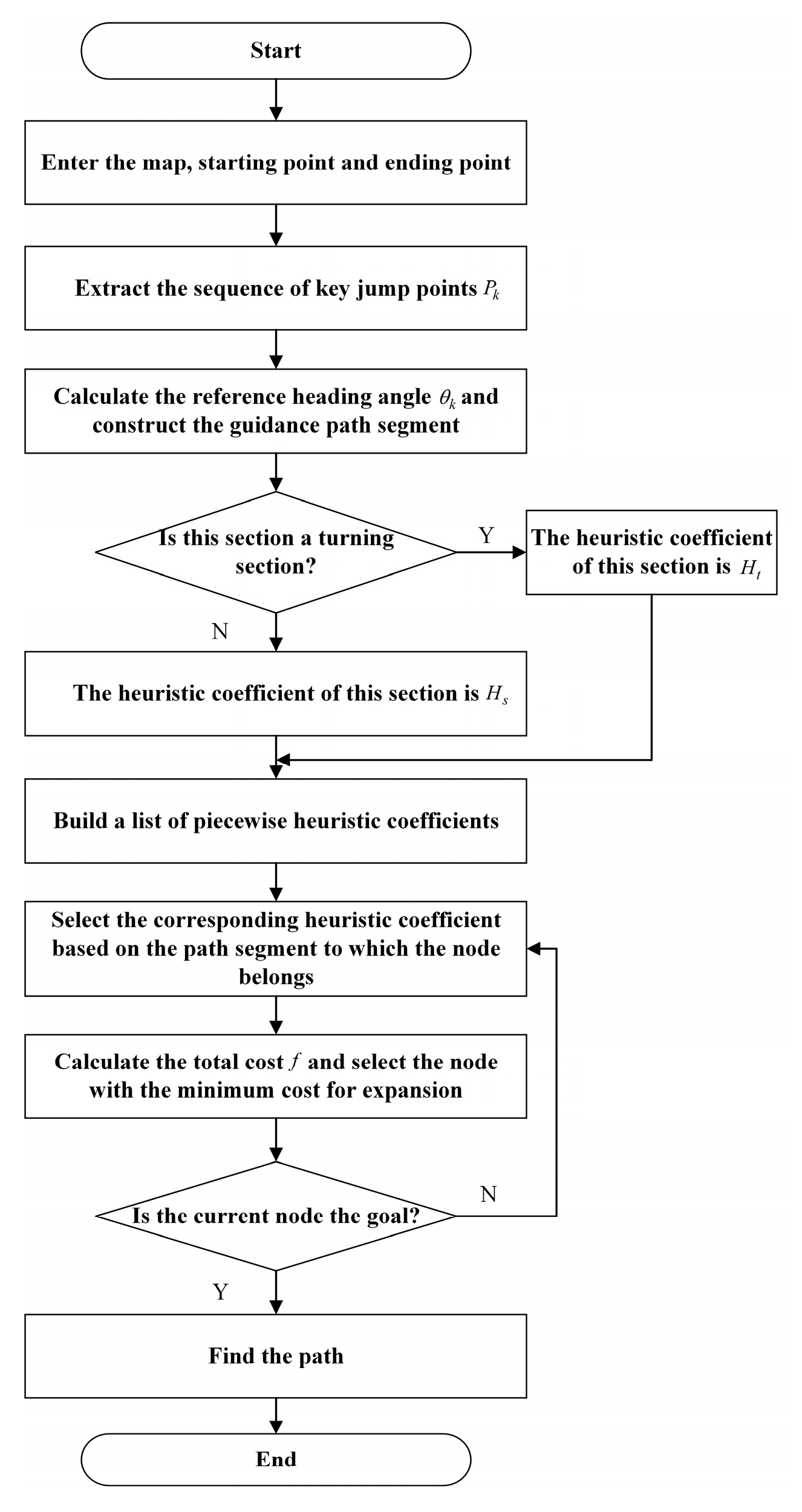 A preliminary path is quickly generated using the JPS algorithm between the start and goal positions, from which a sequence of key jump points is extracted. These jump points act as directional references for the subsequent Hybrid A-star planning process, effectively reducing unnecessary exploration into dead zones. For each jump point, a reference heading angle is calculated based on the coordinates of two adjacent jump points. By analyzing heading angle differences and axis alignment between successive segments, the path is classified into either turning or straight segments. Each segment is then assigned a dynamic heuristic coefficient, resulting in a segment-wise heuristic coefficient list. This allows accelerated node expansion in straight-line regions and enhanced path smoothness in turning regions. When the expanding node enters a predefined tolerance region around the next jump point, the algorithm switches to the corresponding heuristic coefficient for that segment. The total cost function integrates the travel cost, steering continuity penalty, and directional deviation penalty, thereby promoting efficient forward exploration while constraining node expansion in non-optimal directions. The overall algorithm workflow is shown in