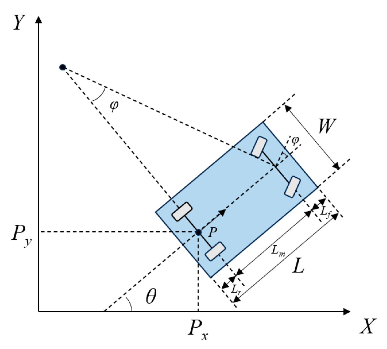 represents the front-wheel steering angle. In addition to these motion parameters, the figure also presents key geometric parameters of the vehicle, including