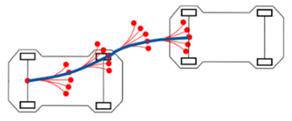 Figure 4. The red line segments correspond to expansion trajectories, red dots mark the expanded nodes, and the blue solid line shows the generated path. This approach allows successor nodes to occupy arbitrary positions within the grid, rather than being confined to grid cell centers as in the standard A-star algorithm. As a result, the Hybrid A-star algorithm more accurately models continuous motion and supports the planning of kinematically feasible trajectories.