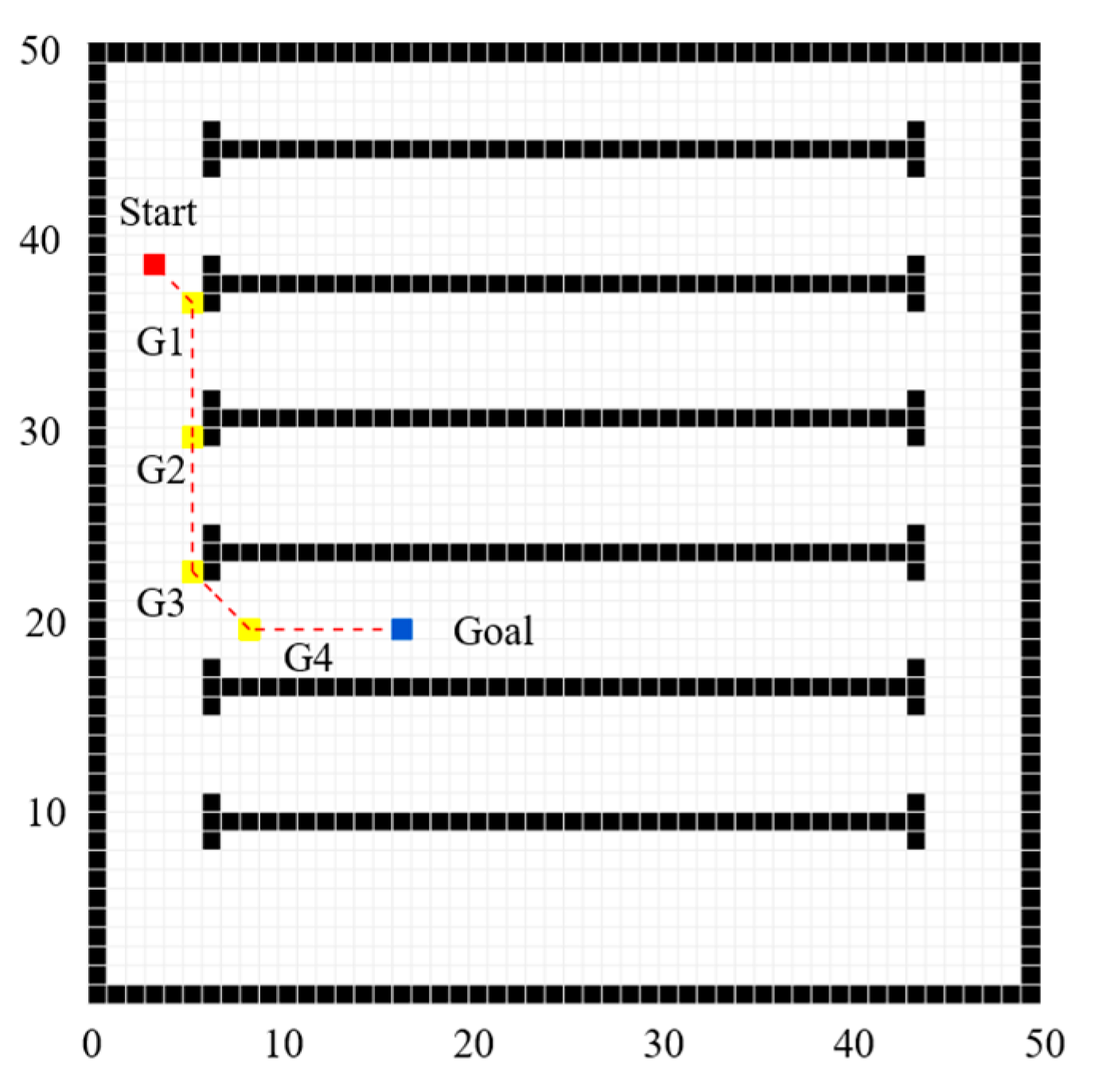 8]. A-star algorithm uses a heuristic function to search for the shortest path on a grid map. However, in situations with dense obstacles, it is prone to generating a large number of redundant nodes and resulting in decreased computational efficiency [