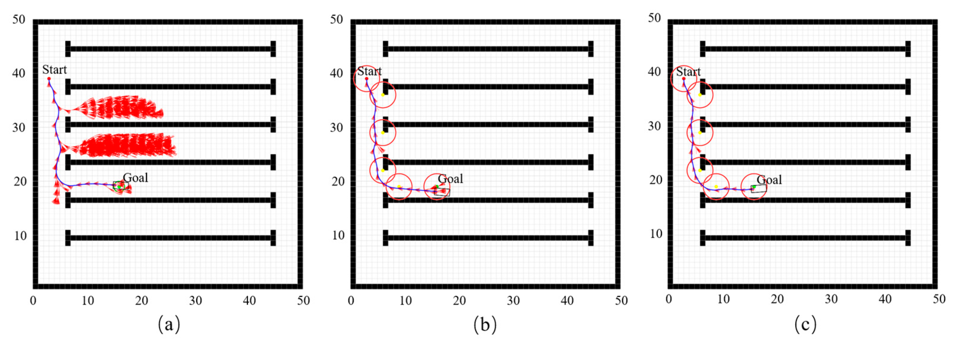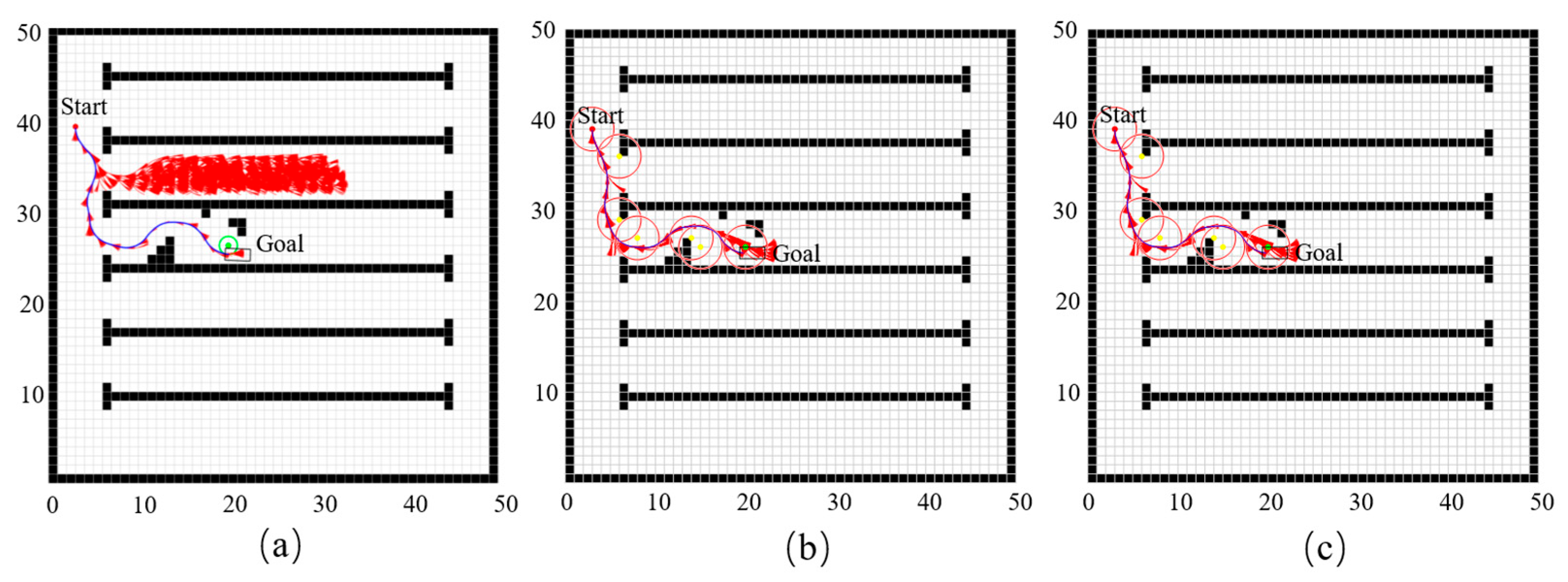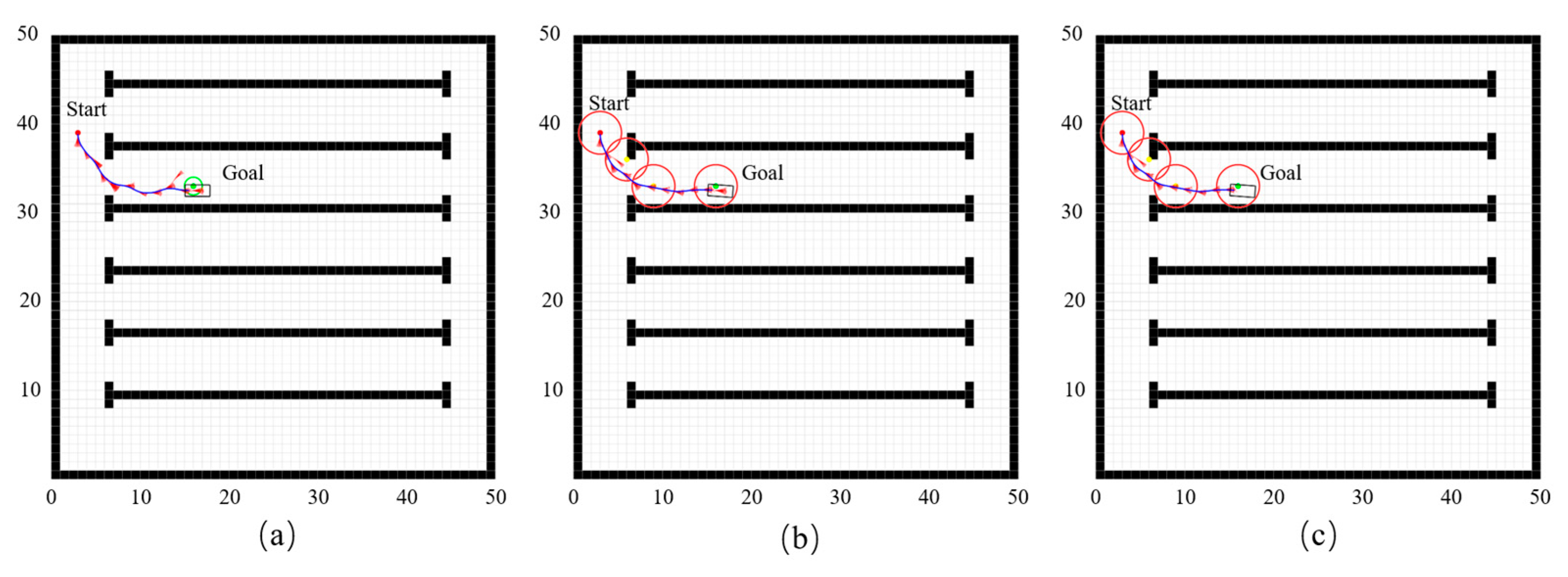 Figure 9a–c present the results of the standard Hybrid A-star, DG–Hybrid A-star, and Dy–DG–Hybrid A-star algorithms, respectively. In
