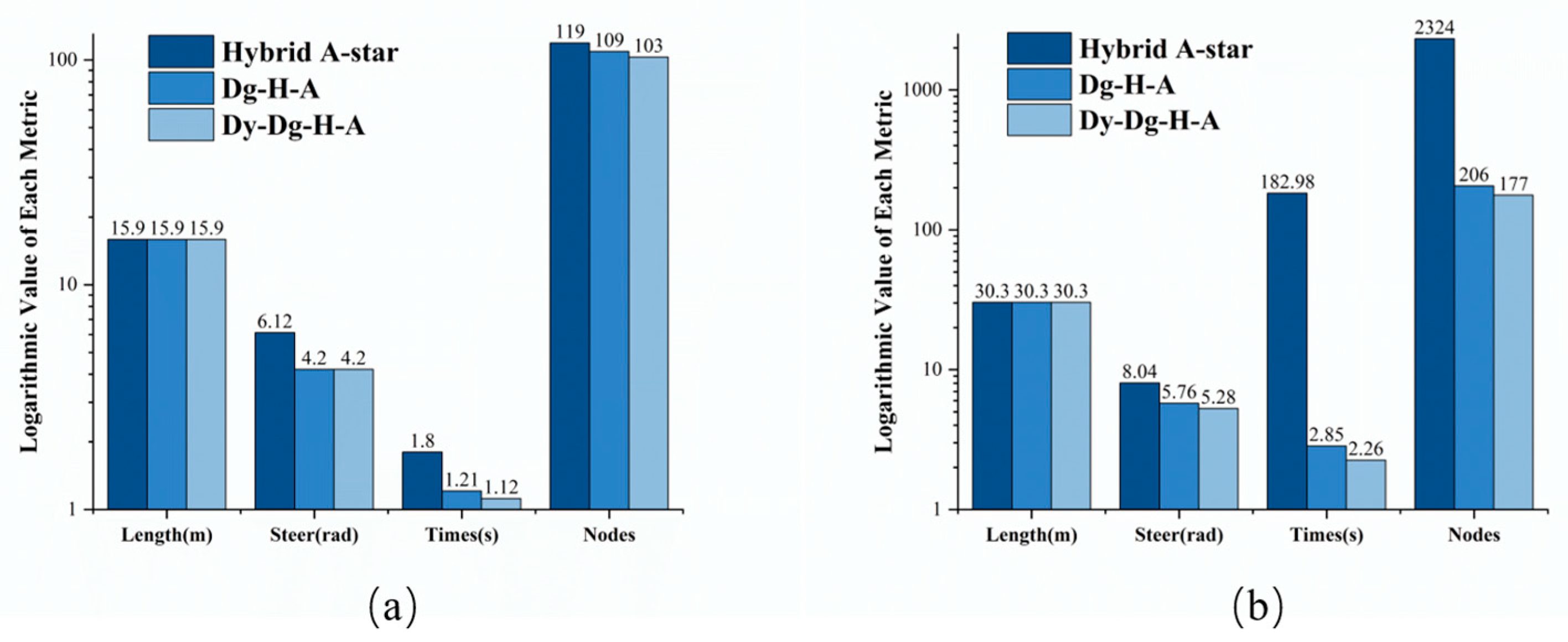Figure 12, as all algorithms produce identical path lengths, only the improvements in the remaining three metrics are evaluated for comparison. The Dy–DG–Hybrid A-star algorithm consistently achieves better performance than the other two methods in terms of steering smoothness, planning efficiency, and search efficiency. In the case of long-distance path planning under setup 2, the DG–Hybrid A-star and Dy–DG–Hybrid A-star algorithms reduce computation time by 98.44% and 98.76%, and the number of expanded nodes by 91.14% and 92.38%, respectively, highlighting the enhanced scalability of the proposed approach.