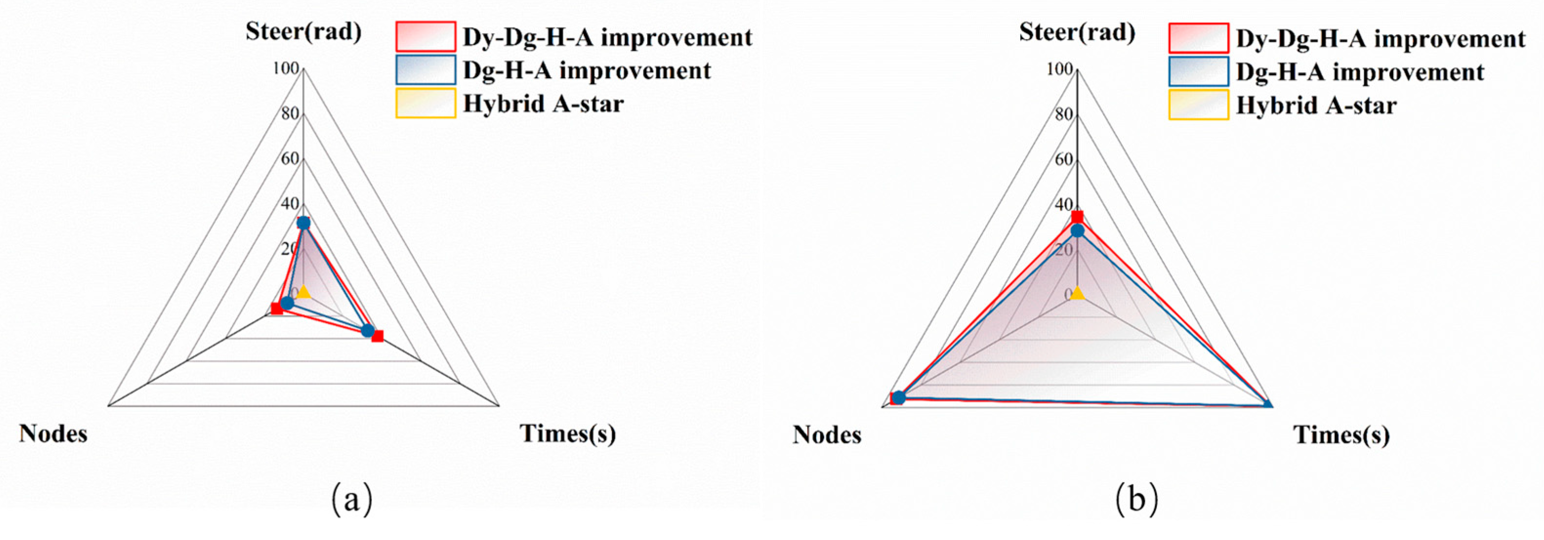 Figure 12a, the Dy-Dg-H-A improvement represents the improvement rates of the Dy–DG–Hybrid A-Star algorithm compared to the Hybrid A-Star algorithm. Notably, in