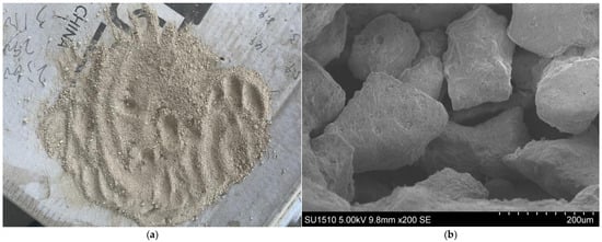 In the study, the coral sand sample used was coral calcareous sand from an island reef in the SCS. The principal component of the sand is calcium carbonate. The macro- and micro-figures and the particle distribution of coral sand are shown in Figure 2 and Figure 3, while the basic physical property indices determined by a geotechnical engineering investigation report of a certain island in Hainan, are shown in Table 1. To regulate the particle size of coral sand used in the tests, in accordance with the Chinese standard for geotechnical testing method (GB/T 50123-2019) [18], a 2 mm particle size standard sieve was used to ensure the particle size of the coral sand for the tests was restricted to within 2 mm.